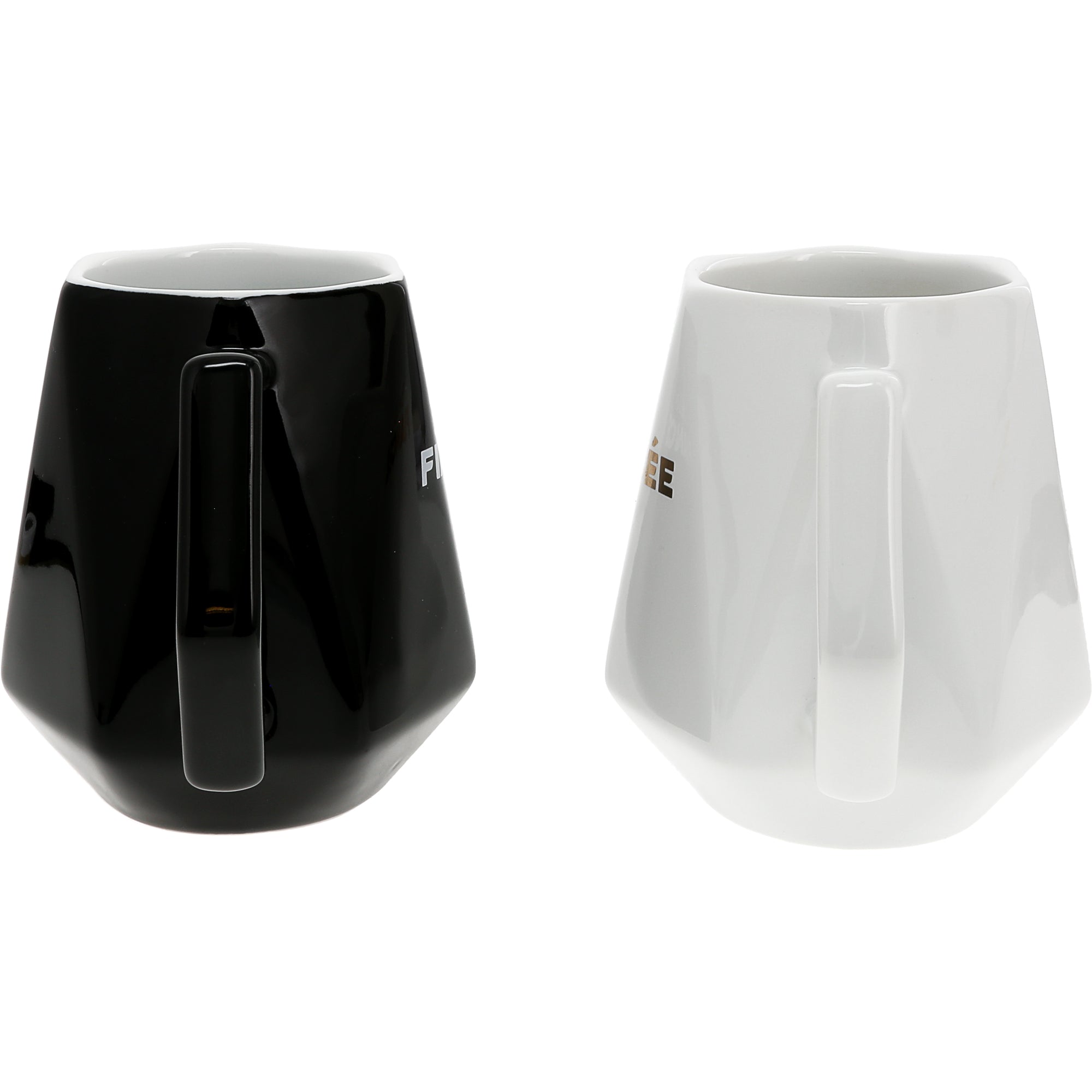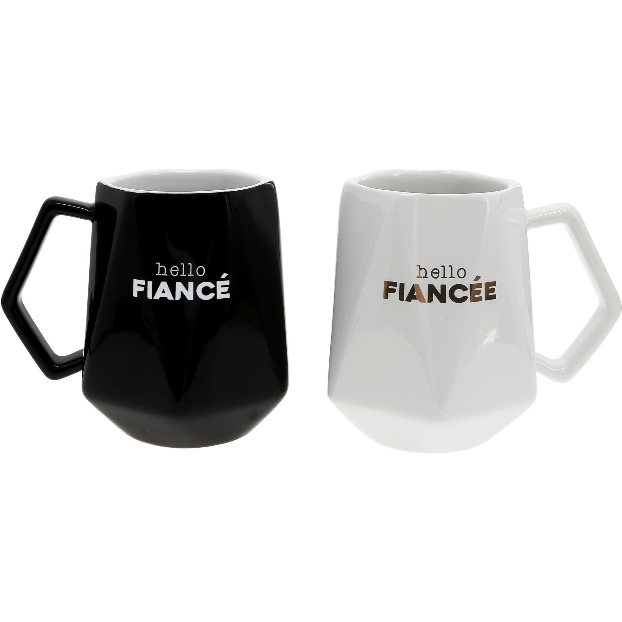- PREMIUM QUALITY: This matching 17 oz mug set includes two ceramic geometric mugs—one matte black with metallic silver lettering reading “hello fiancé” and one glossy white with metallic gold lettering reading “hello fiancée.” Each mug features a unique angular handle for a modern touch and a comfortable hold. Designed with raised metallic decals for a luxurious finish, these mugs are FDA and Prop 65 approved for safe use. Packaged in a sleek custom gift box with a gold ribbon and protective shipper, ready for gifting right out of the box.