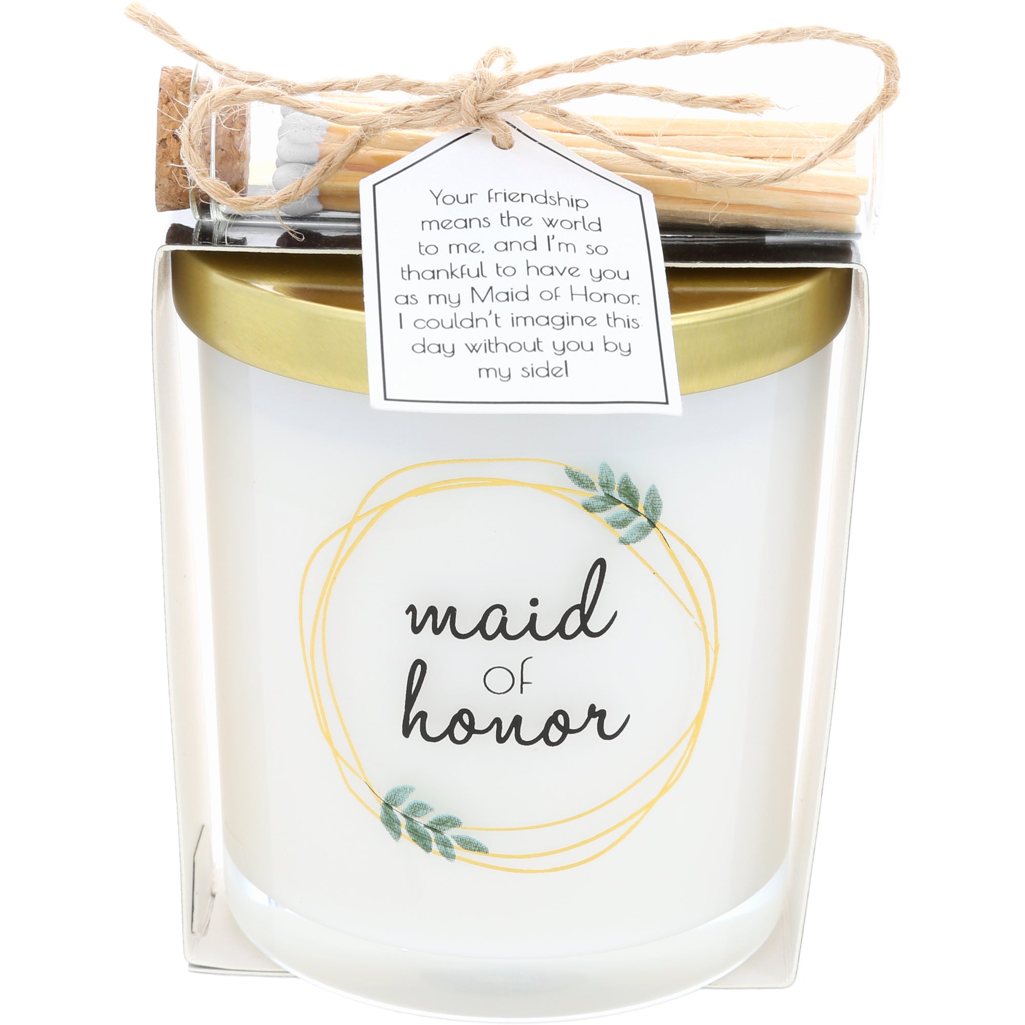 - IN-HOUSE DESIGN: Featuring the sentiment “Maid of Honor” framed by a simple gold wreath design, this candle embodies gratitude and appreciation. The attached tag reads: “Your friendship means the world to me, and I’m so thankful to have you as my maid of honor. I couldn’t imagine this day without you by my side.” Each detail captures love, loyalty, and the importance of shared memories.