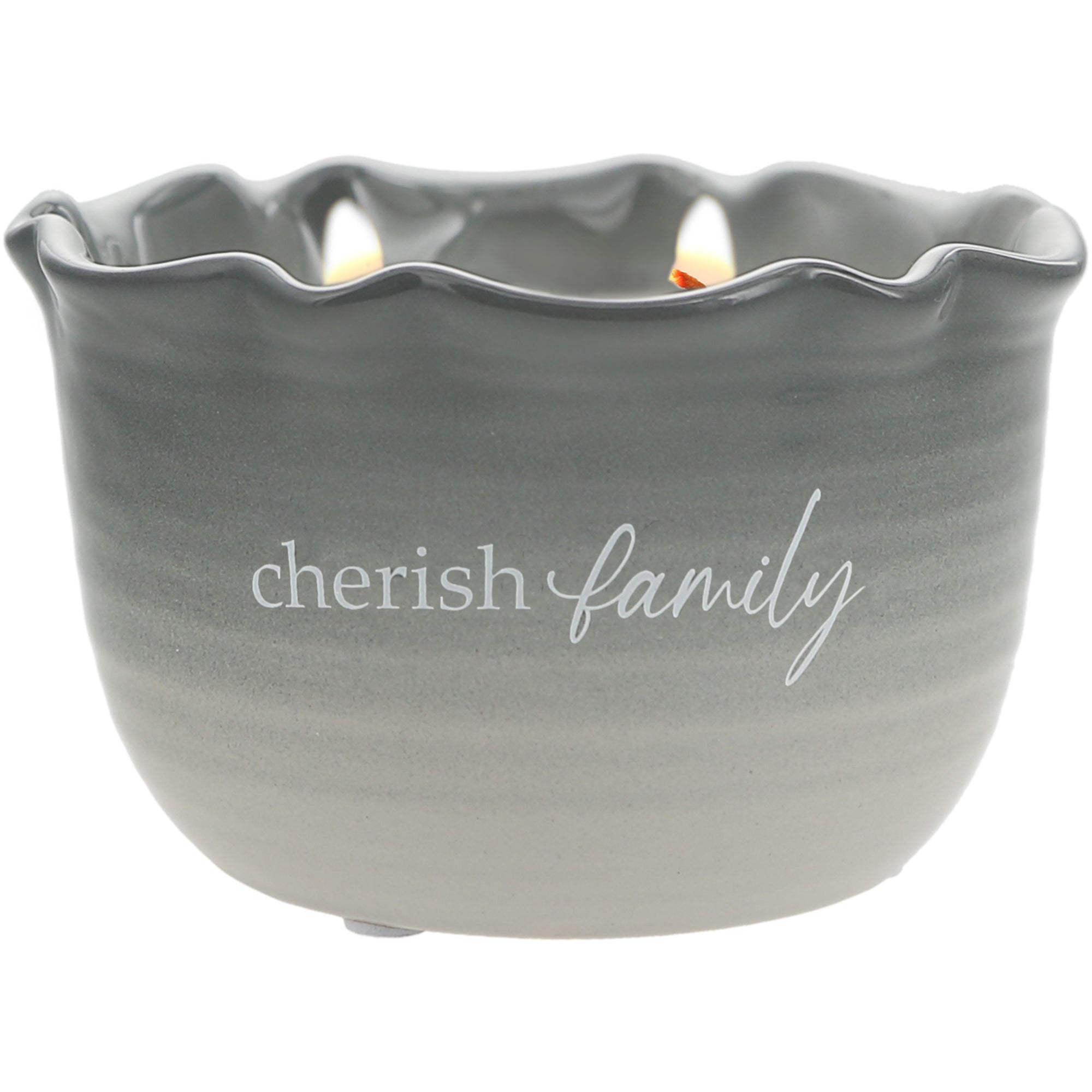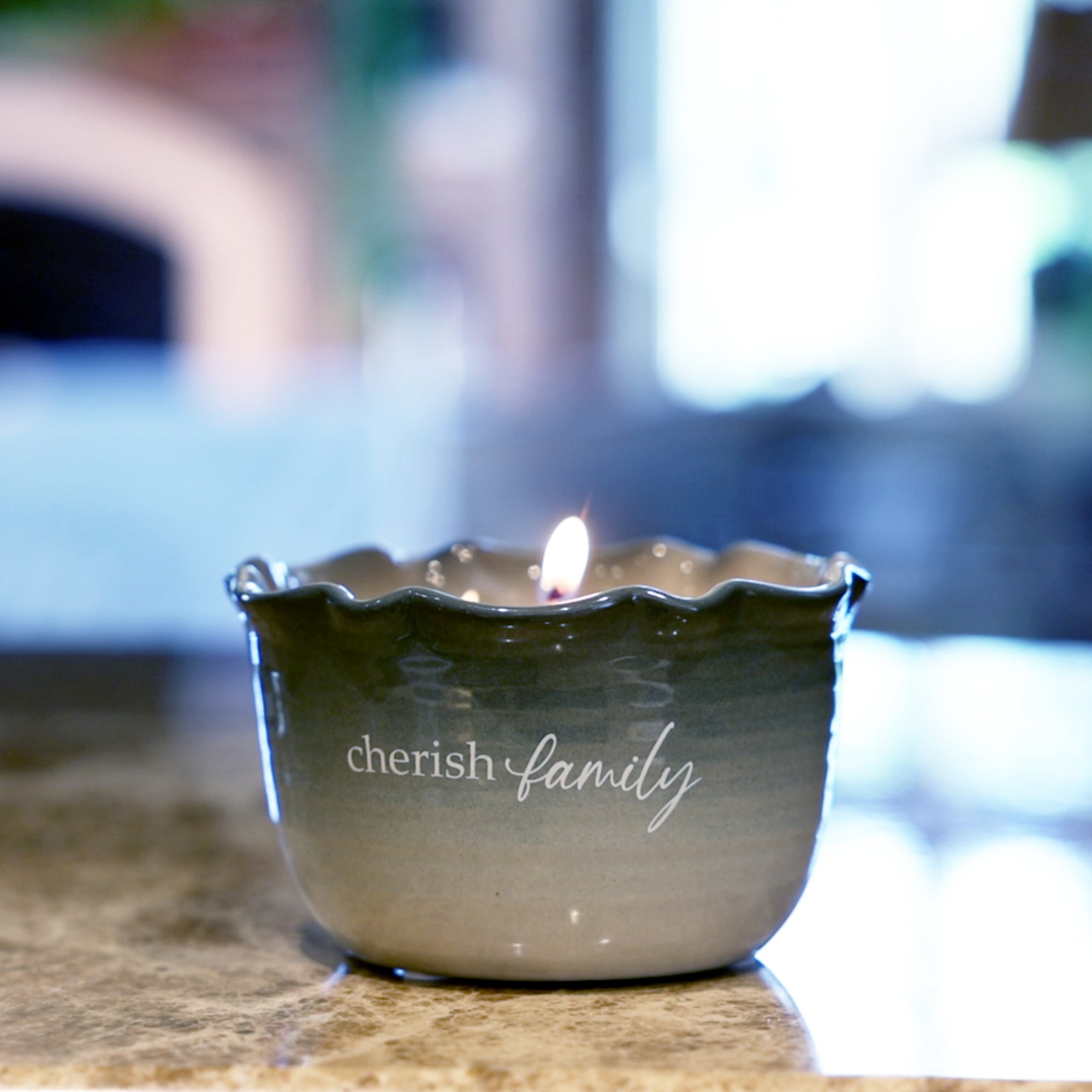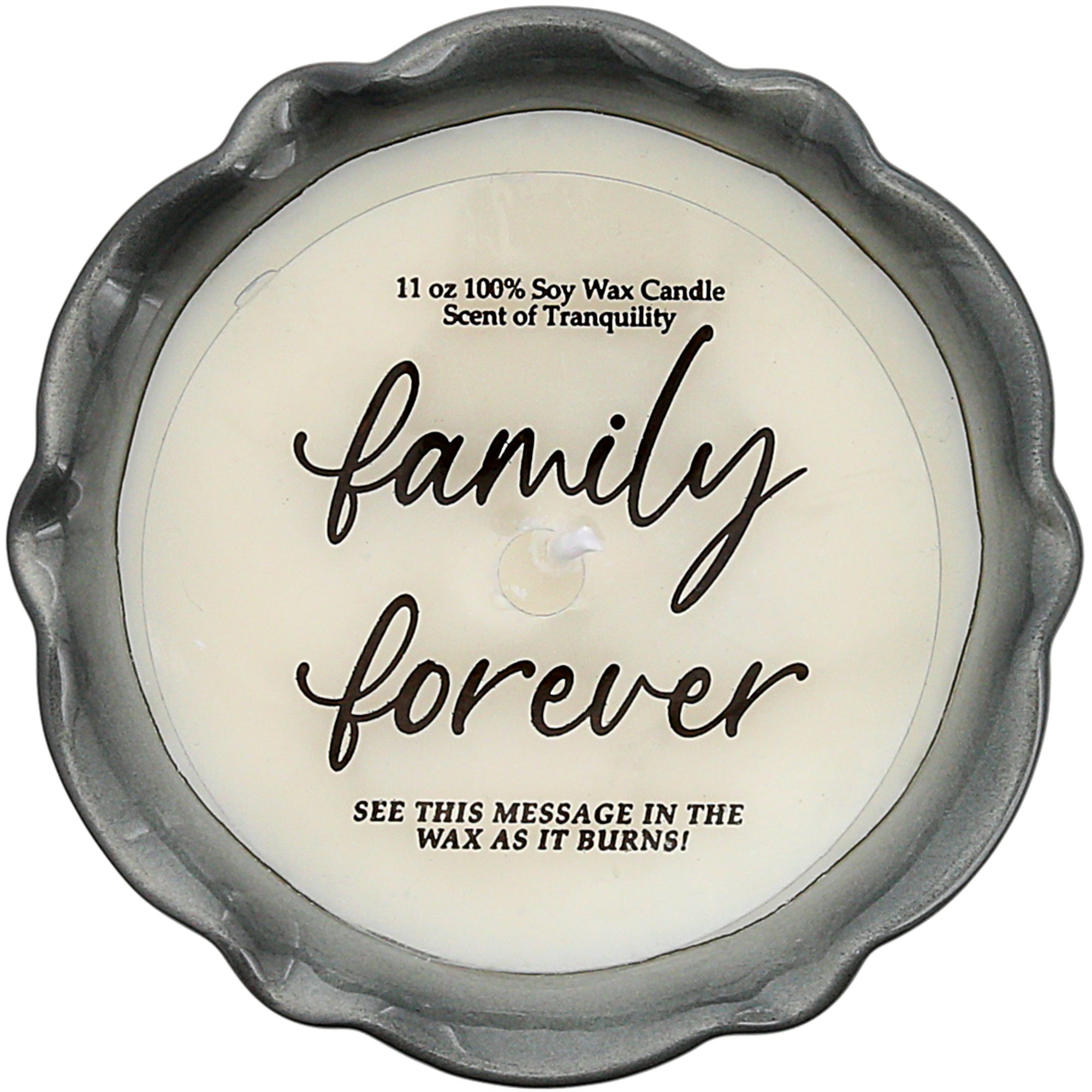 - IN-HOUSE DESIGN: The new & innovative candle offers a unique message for your loved one within the wax as time progresses. You will see cursive written "Family Forever" sentiment after about 10 minutes. As you watch, the entire decal will appear after 60 minutes. Then, the message will hide again and reappear with each burn. The front of the candles has a simplistic "Cherish Family" decal accompanied by an ombre tan & gray pattern.