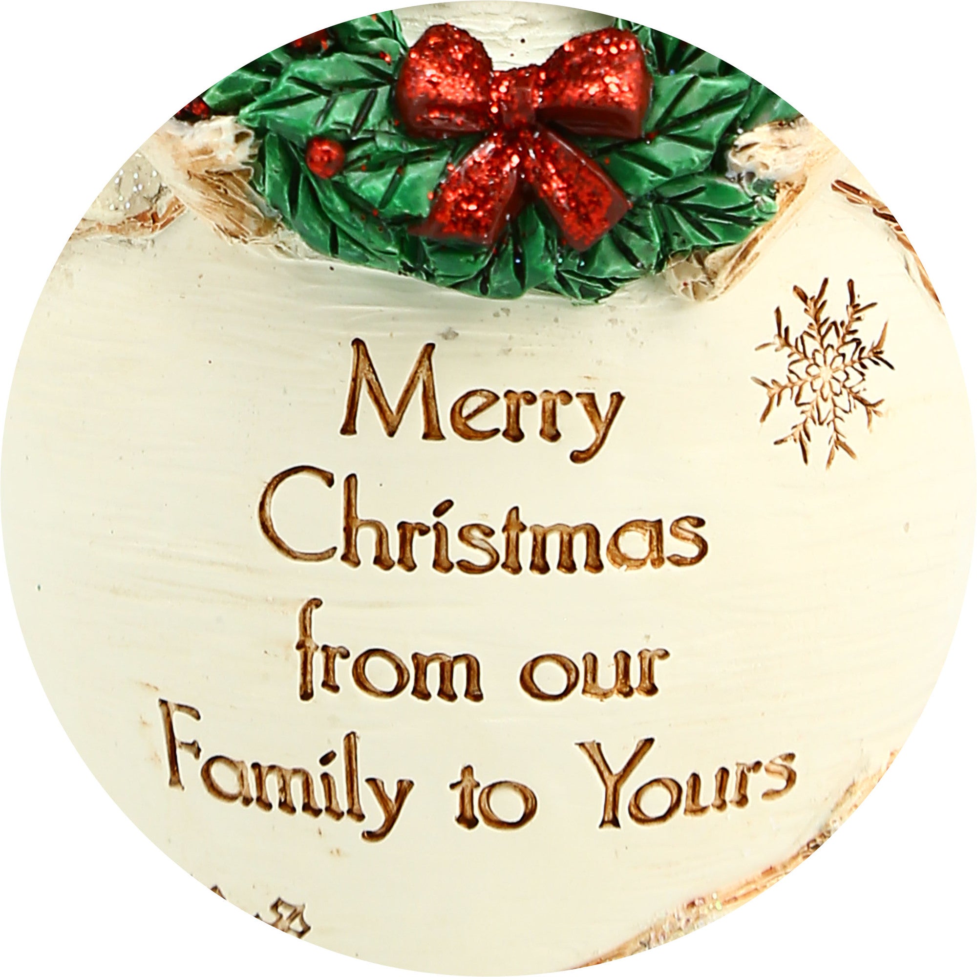 - IN-HOUSE DESIGN: "Merry Christmas From Our Family To Yours" text is debossed and hand-painted onto the front of the figurine.