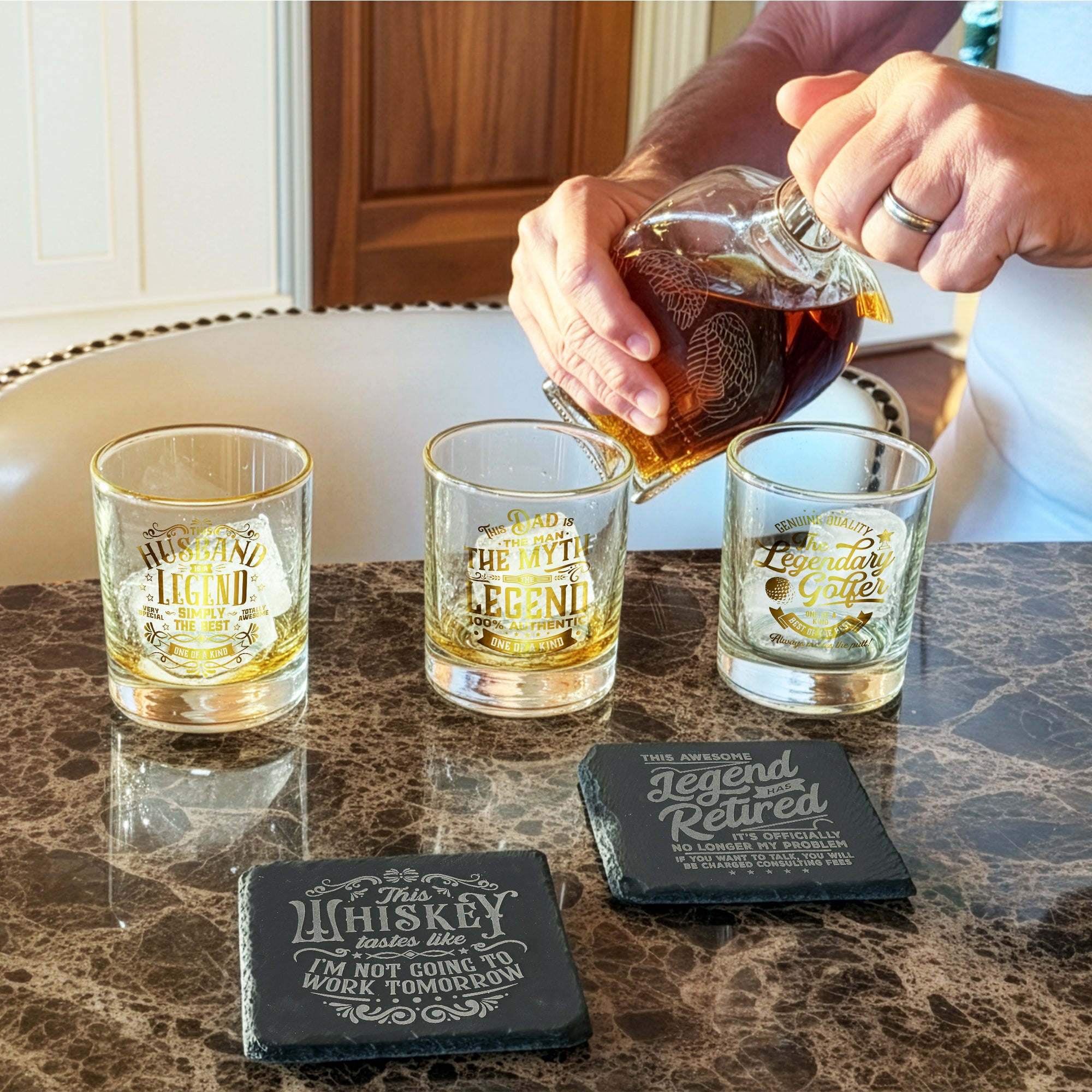 - IN-HOUSE DESIGN: The gold electroplated rim is accompanied by the gold "This Dad Is The Man The Myth The Legend 100% Authentic One Of A Kind" sentiment decal on the front side of the whiskey along with banners and stars. Glassware with a refined, aesthetically pleasing look.