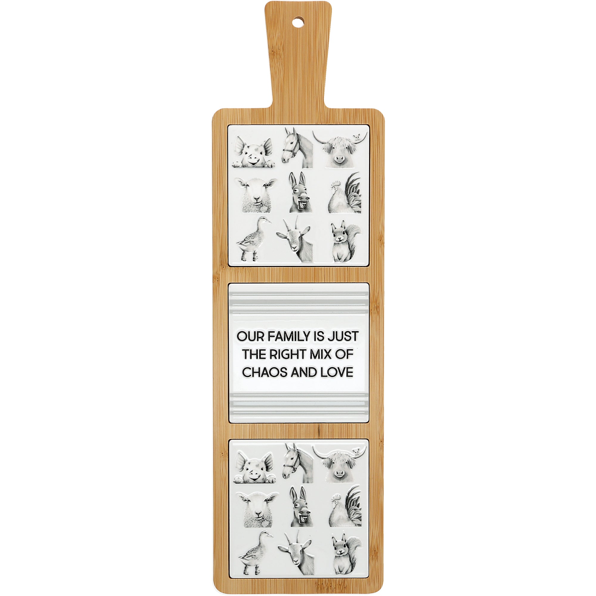 - PREMIUM QUALITY: This 16.5" bamboo and ceramic trivet blends warmth, artistry, and humor into one beautiful piece. The glossy ceramic tile features 3D-printed artwork of adorable animals surrounding the playful sentiment, “Our family is just the right mix of chaos and love.” The bamboo frame offers a natural finish with a handle and hanging hole, perfect for displaying in kitchens or entryways. Designed for decorative use only, each trivet comes safely packaged in a white die-cut box.
