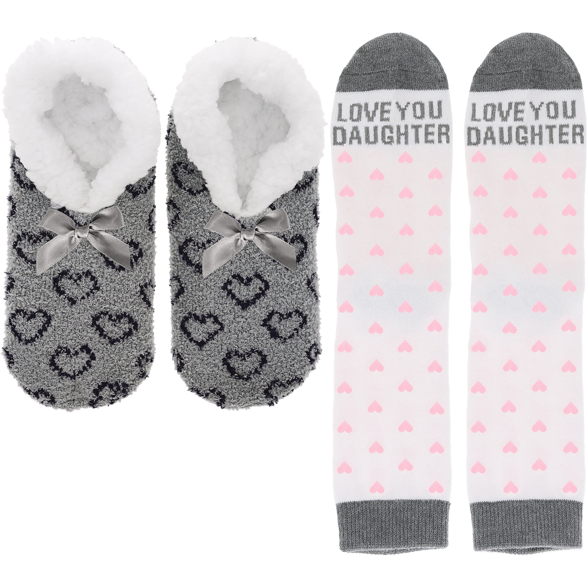 - IN-HOUSE DESIGN: The “Love You Daughter” sentiment is featured on both the socks and slippers, with a pink heart pattern adding a sweet touch. The matching ribbon detail on the slippers enhances the design, making this set a thoughtful and stylish gift. The anti-slip soles of the slippers also display the same heartfelt sentiment, making this set a perfect combination of function and love.