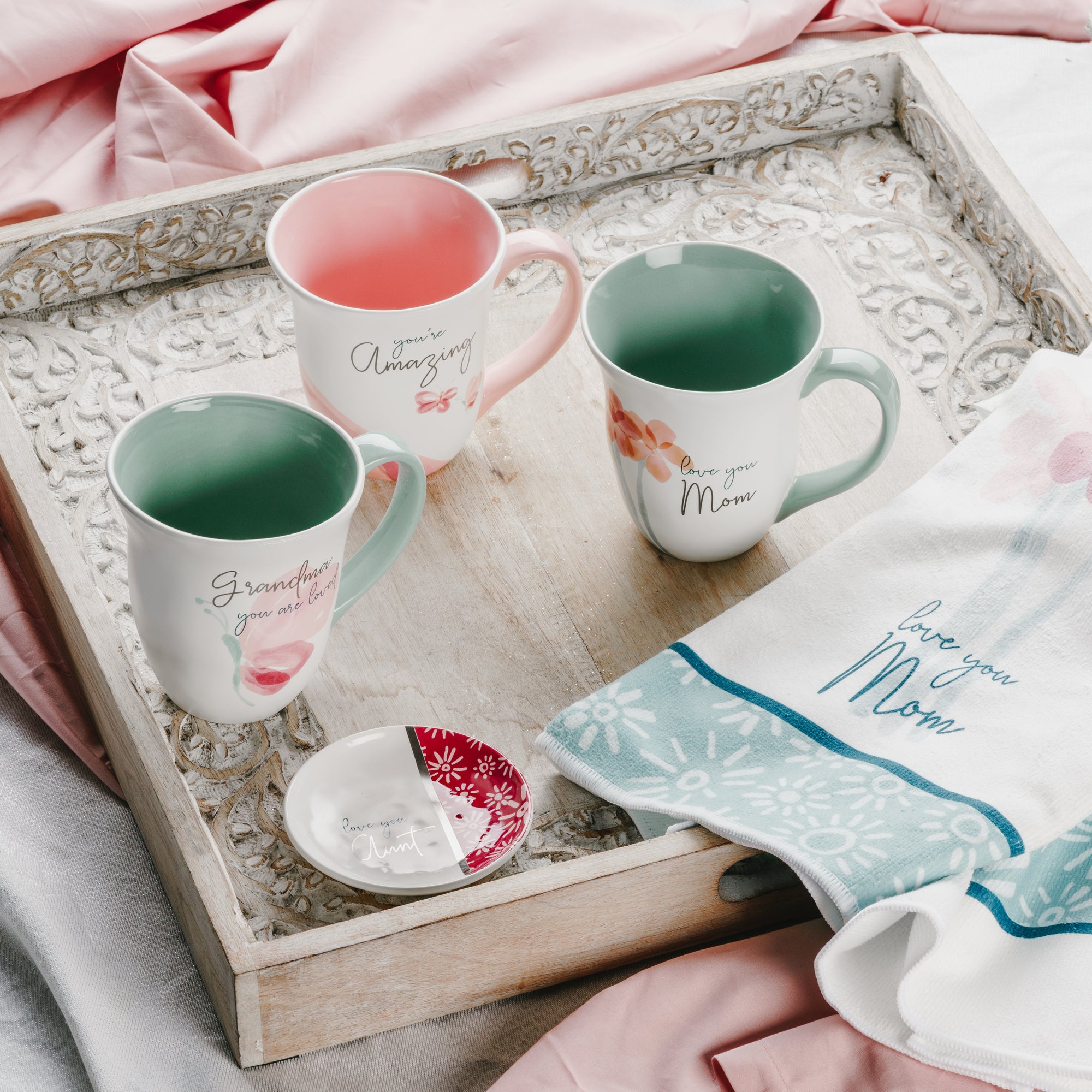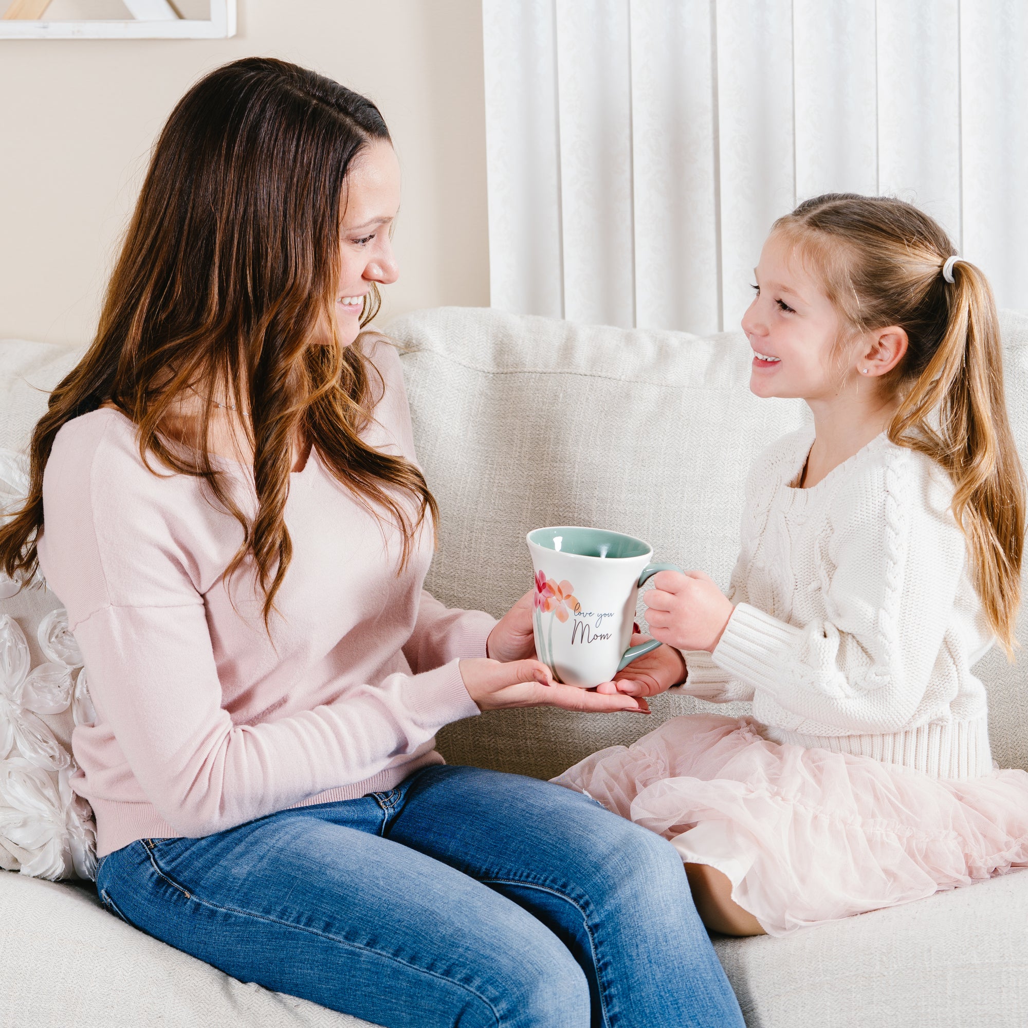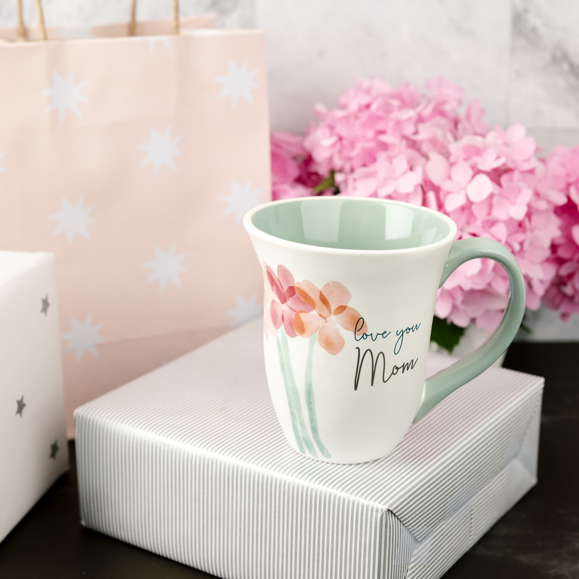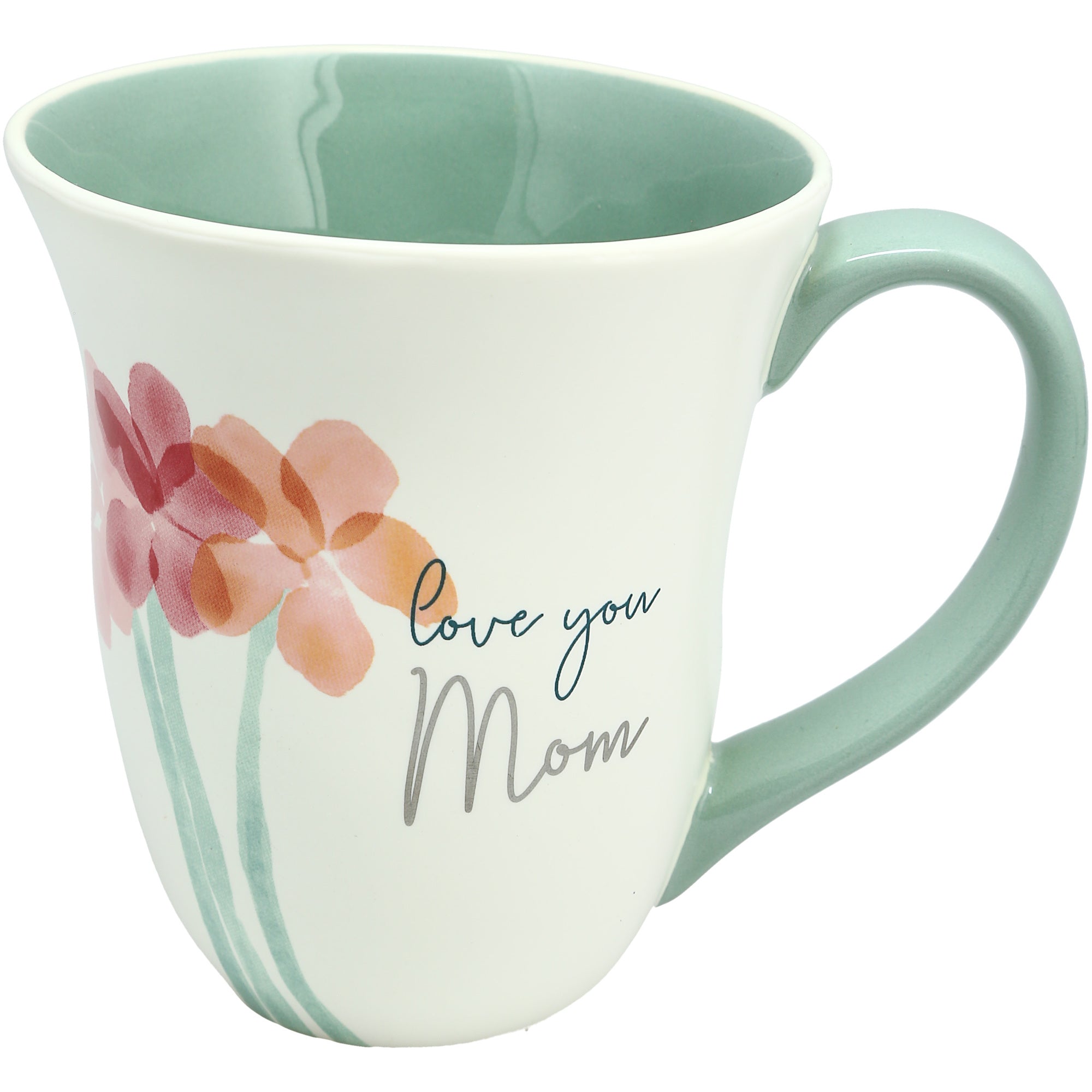 • IN-HOUSE DESIGN: Pink, orange, green and purple watercolor paint inspired flowers are accompanied by real silver and teal "Love You Mom" sentiment on the front side of the matte white cup. Interior and handle have a glossy glaze prop 65 food safe finish. The artwork was designed by artist Pam Vale who has always loved sheer, soft and happy colors.
