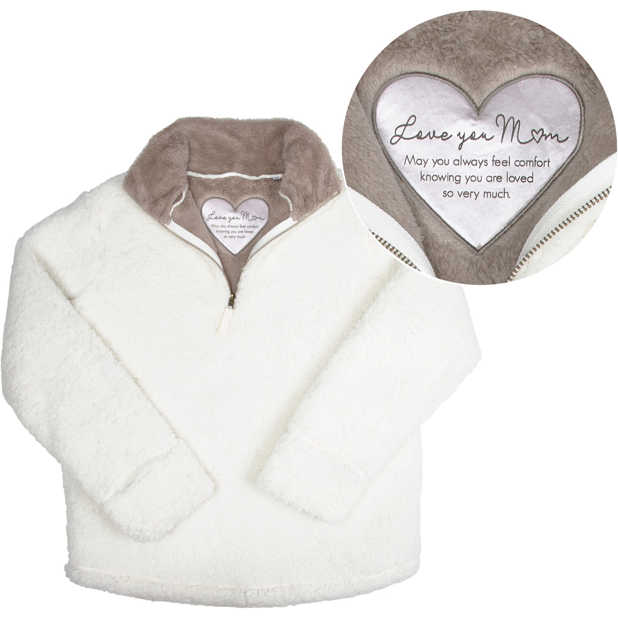 - IN-HOUSE DESIGN: "Love You Mom; May You Always Feel Comfort Knowing You Are Loved So Very Much." text is printed onto the embroidered heart detail.
