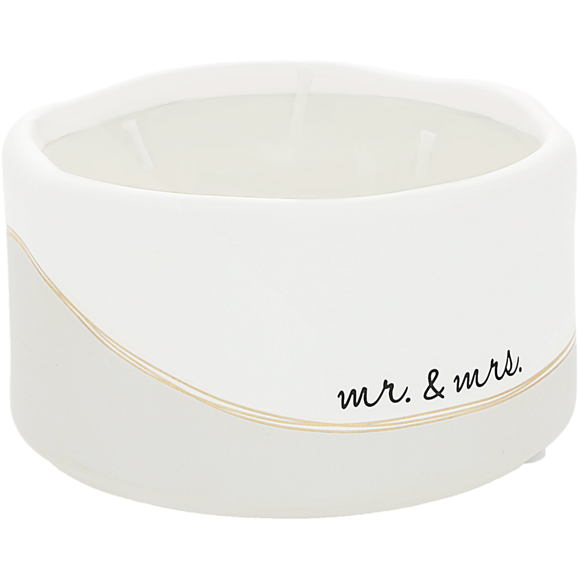 - IN-HOUSE DESIGN: The new & innovative candle offers a unique message for your loved one within the wax as time progresses. You will see cursive written "Together Is Better" sentiment after about 10 minutes. As you watch, the entire decal with an intertwining golden triple-string and leaf design will appear after 60 minutes. Then, the message will hide again and reappear with each burn. The front of the candles has a simplistic "Mr. & Mrs." decal accompanied by iridescent gray and metallic gold striped wrap-around patterns on a matte white exterior handmade feel vessel with a glossy interior.