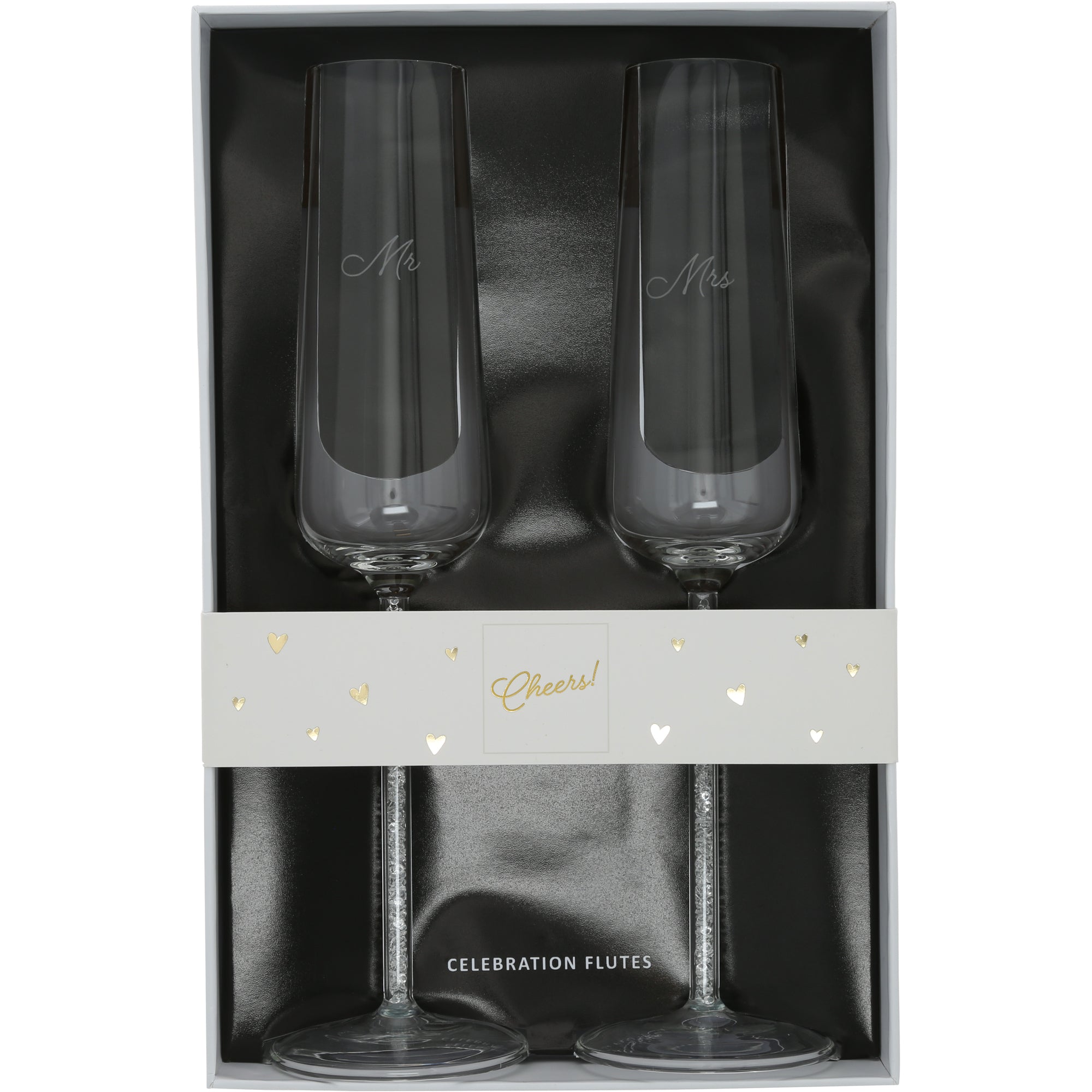 - PREMIUM QUALITY: This wonderful set of champagne flutes is crafted from glass with sparkly clear crystal gems within the stemmed glassware. The black background white gift box has heat-stamped hearts on the "Mr. & Mrs." lid and a wrapped belly band with a "Cheers!" sentiment.