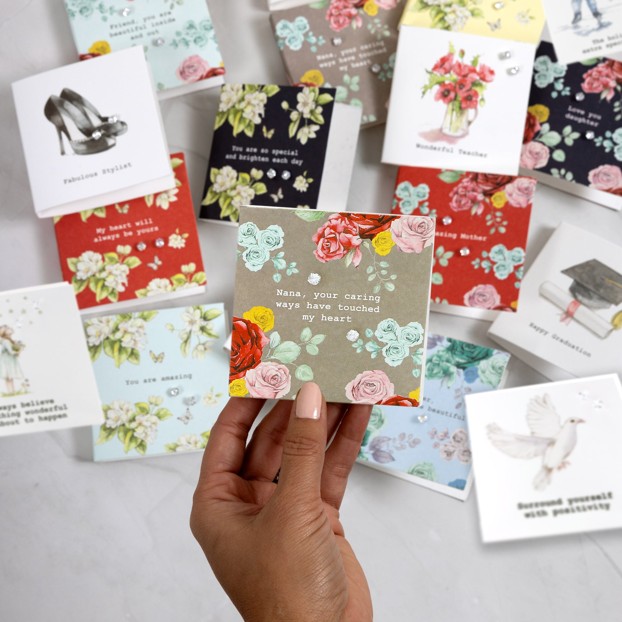 - IN-HOUSE DESIGN: The printed card has a gray background and a beautiful blue, yellow, pink, and red rose floral design. The earrings are strategically placed within the florals. The typewritten white "Nana, Your Caring Ways Have Touched My Heart" sentiment is placed in the center of the greeting card.