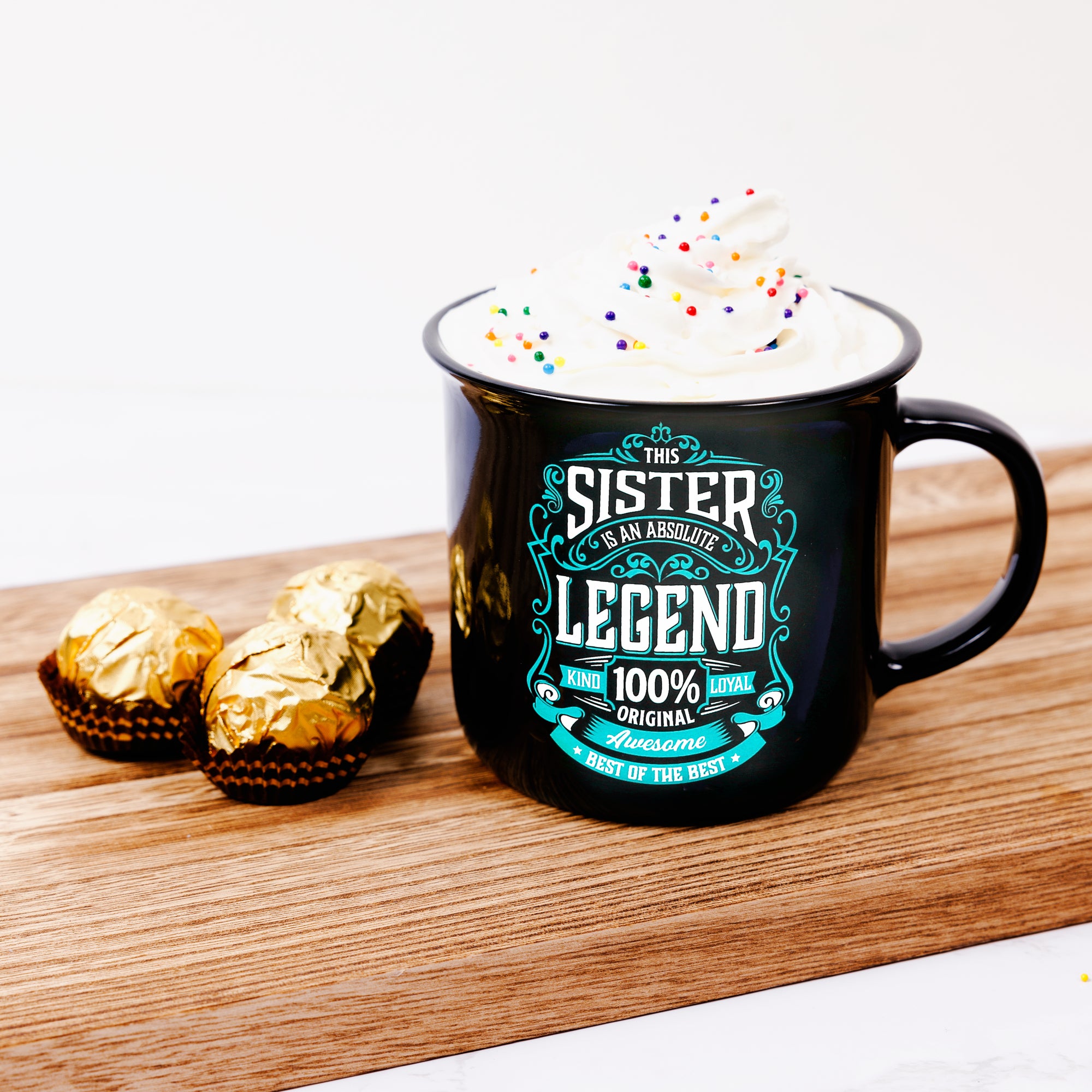 • IN-HOUSE DESIGN: "This Sister Is An Absolute Legend, Kind, Loyal, 100% Original, Awesome, Best Of The Best" decal is in full caps, black and white, with multi-directional lines of words intertwined with seafoam green swirls and banners, which stands out on the stark black exterior. The seafoam green interior has a black "Legends Of This World" logo on the interior only when the handle is facing to the right side only.