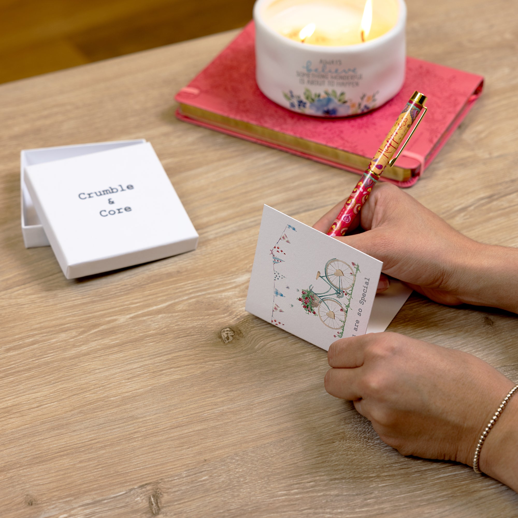 - IN-HOUSE DESIGN: The cheerful, celebratory printed watercolored basket full of florals with fluttering butterflies and a string of flags, teal and tan vintage bicycle with the earrings strategically placed within the center of the design of the wheels. The typewritten gray "You Are So Special" sentiment is placed below the graphic.