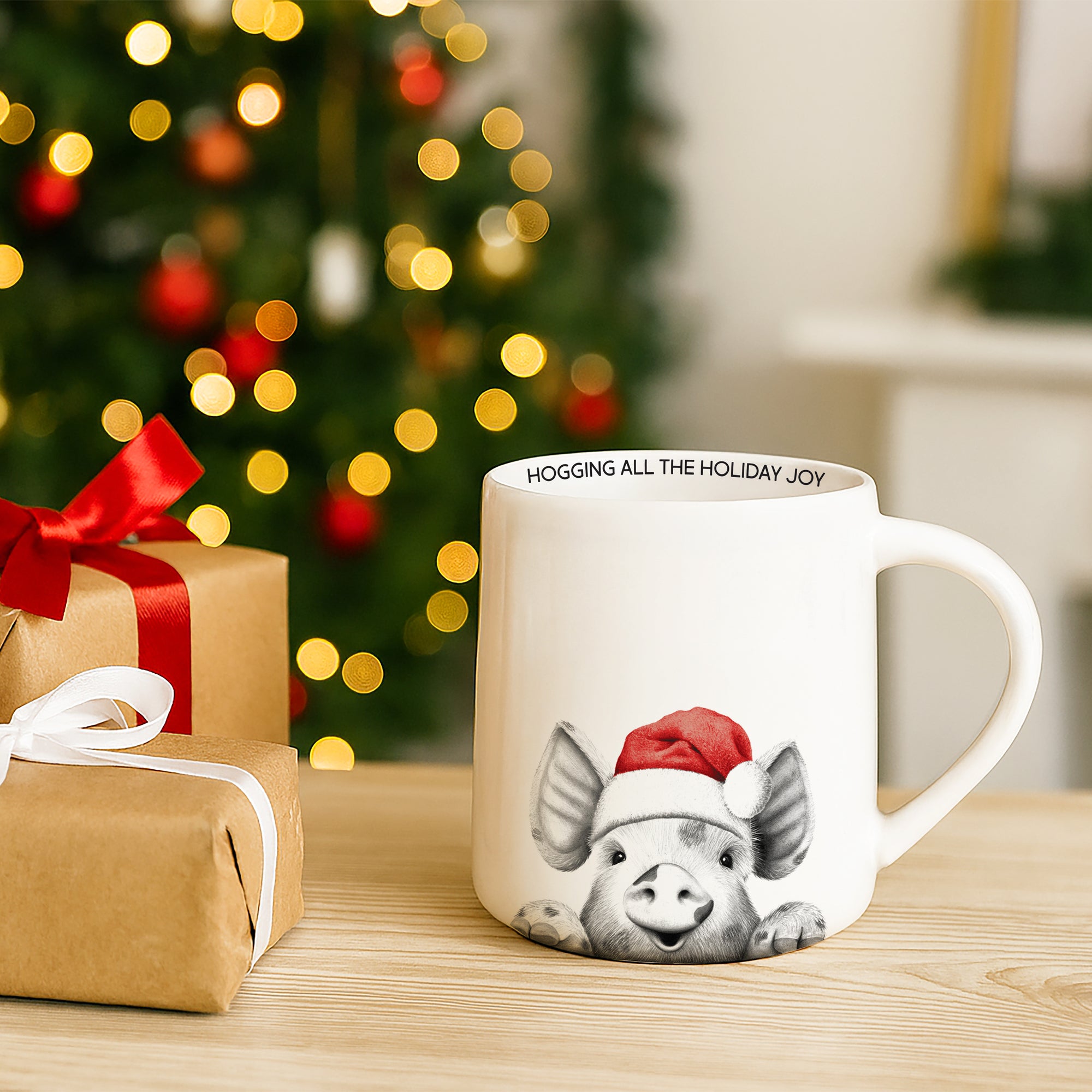• IN-HOUSE DESIGN: The front showcases an adorable piglet wearing a floppy red Santa hat and a warm expression that radiates comfort and cheer. Along the inside rim, the message “Hogging all the holiday joy” is printed in a playful, handwritten-style font. With soft pencil shading, pink tones, and delicate detailing, the illustration captures heartwarming humor and holiday magic in equal measure.