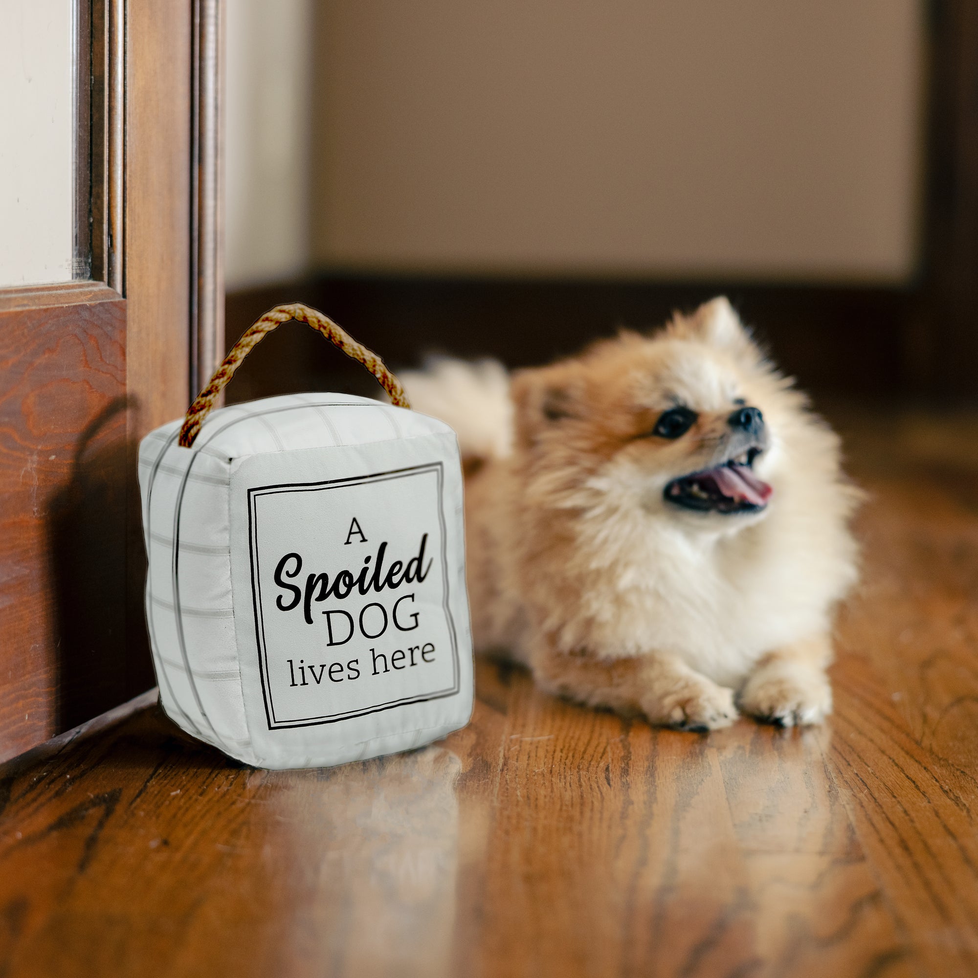 - IN-HOUSE DESIGN: The bottom, top, sides, and back feature a light and dark tan checkered pattern. The front features a dark tan double-lined framing of "A Spoiled Dog Lives Here" sentiment. Also, utilize these as bookends, even put behind a door to prevent the handle from damaging the walls or in front to keep the door propped open.