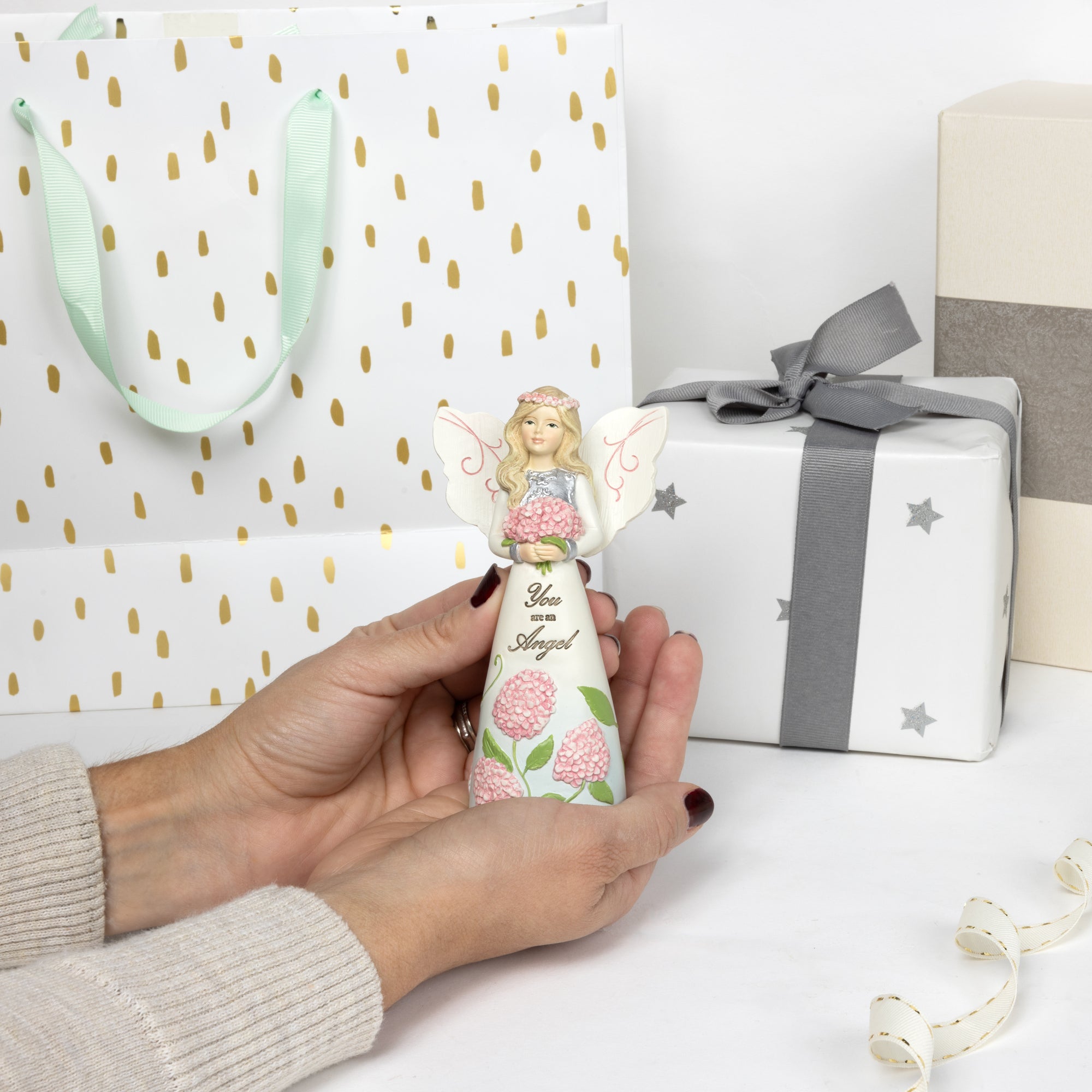 - IN-HOUSE DESIGN: The sentiment "You Are An Angel" is carved in cursive on the center of the bottom half of the dress. The angel statue holds a bouquet of flowers in her hands with ombre green and vined florals at the bottom of her dress. Her beautiful mid-length hair rests neatly on her shoulders and back with a single flower. The silver damask-styled silver details bring her to life.