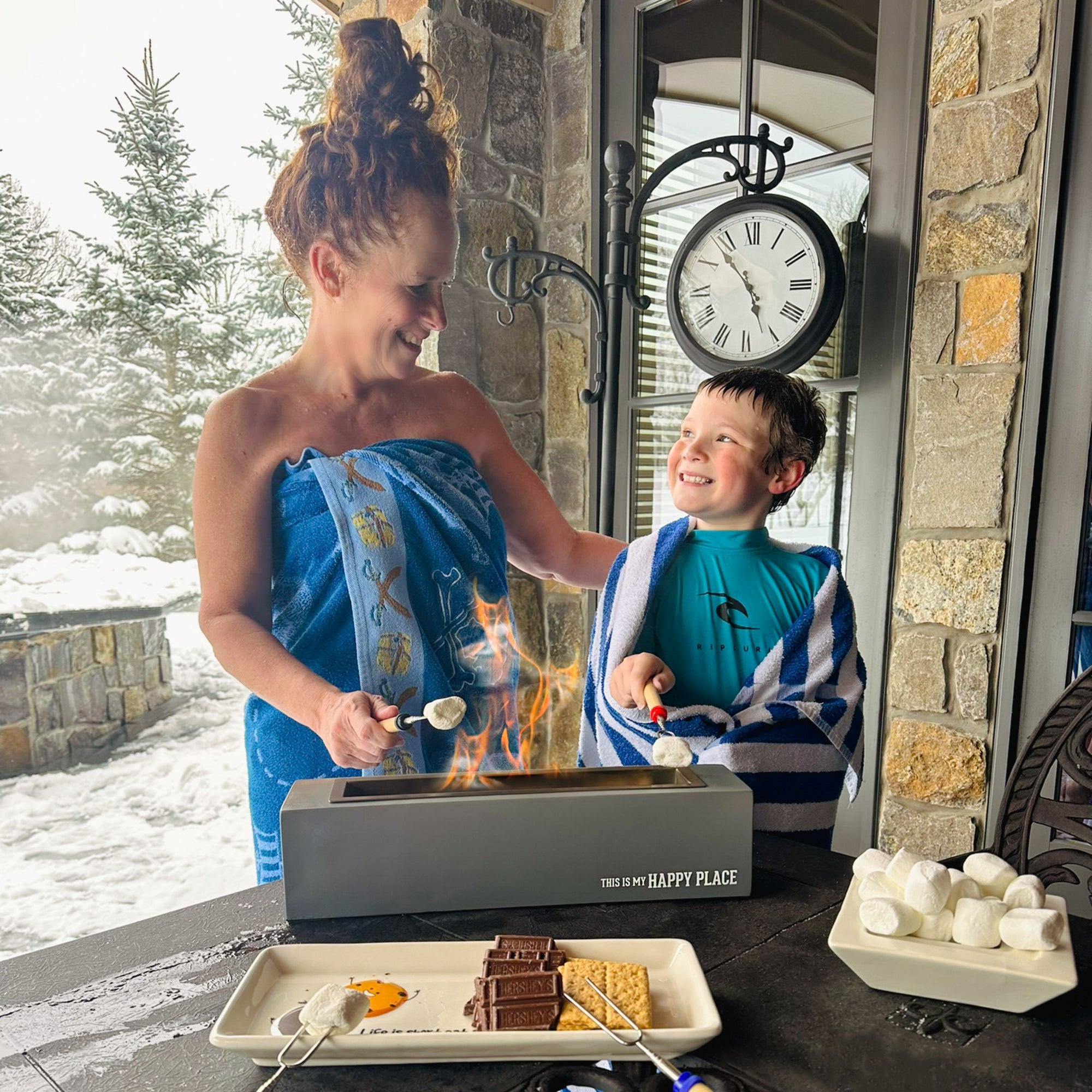 - IN-HOUSE DESIGN: The dark gray smooth surface bears a "This Is My Happy Place" white sentiment in the bottom right corner on the front of the vessel. The four extendable double-pronged stainless steel and wood roasting stick skewers have telescopic ends that expand between 4" and 19.5", plus the 4" long x .5" wide wooden handle. The plastic red, black, blue, and green indicators are great for a family, couple, or group of friends to choose while roasting marshmallows for s'mores.