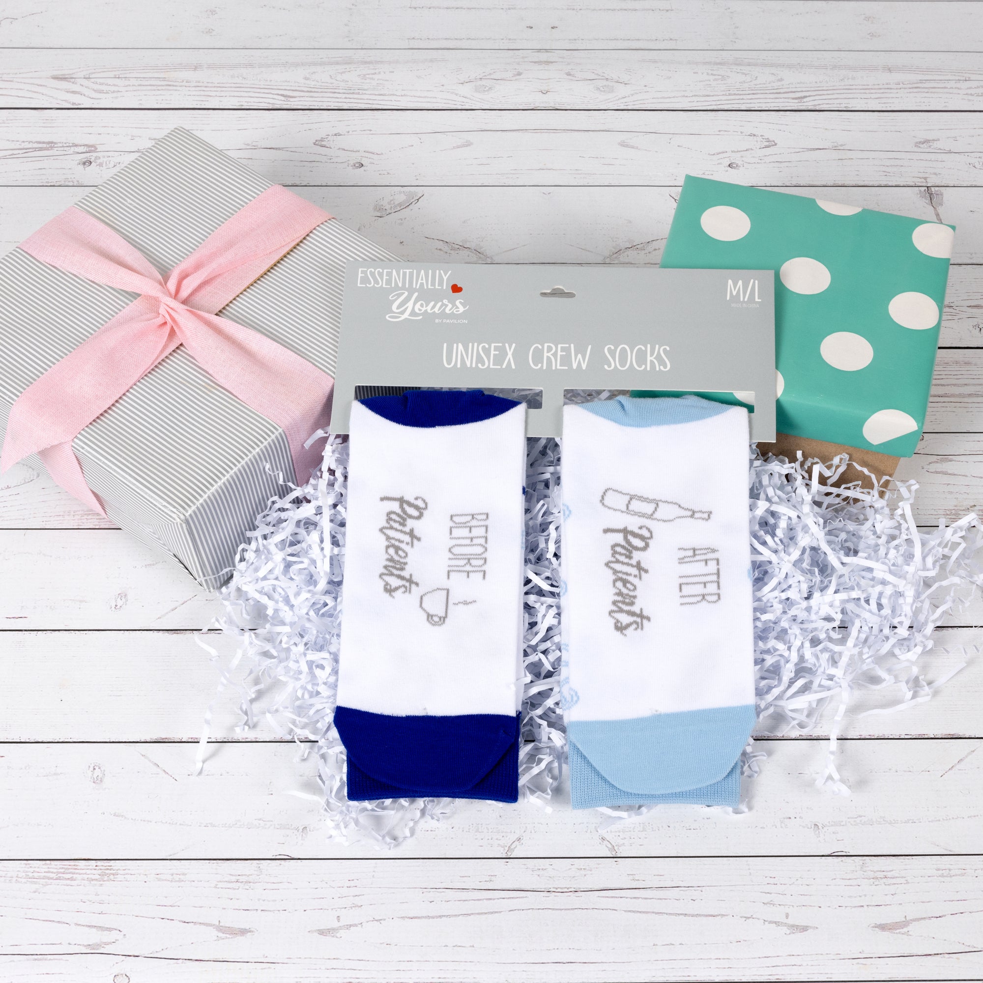 - IN-HOUSE DESIGN: Light and dark blue ankle, heels, and toes are attached to overall white bodies. The dark blue sock has coffee cups, stethoscopes, and hearts with "Before Patients" and a large coffee cup in gray on the bottom of the sock. The light blue sock has wine bottles, stethoscopes, and hearts with an "After Patients" and a large alcohol bottle on the bottom of the sock.