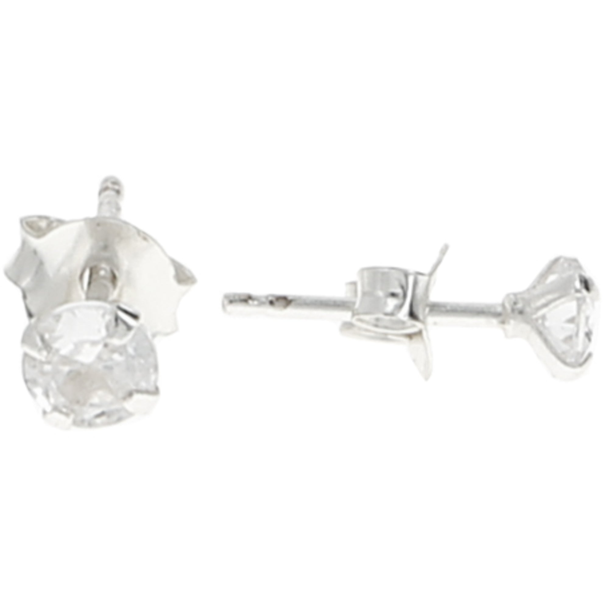 - PREMIUM QUALITY: A 3.25" x 3.25" blank, thick white paper greeting card holds a pair of prong-set earrings on its front. The small .20" studs with one 5mm stone, solid sterling silver, and cubic zirconia gem earrings feature a push-back backing. The card is packaged inside a plastic polybag, with cotton padding between the front and back, neatly tucked inside a white gift box with a logo printed on the top.