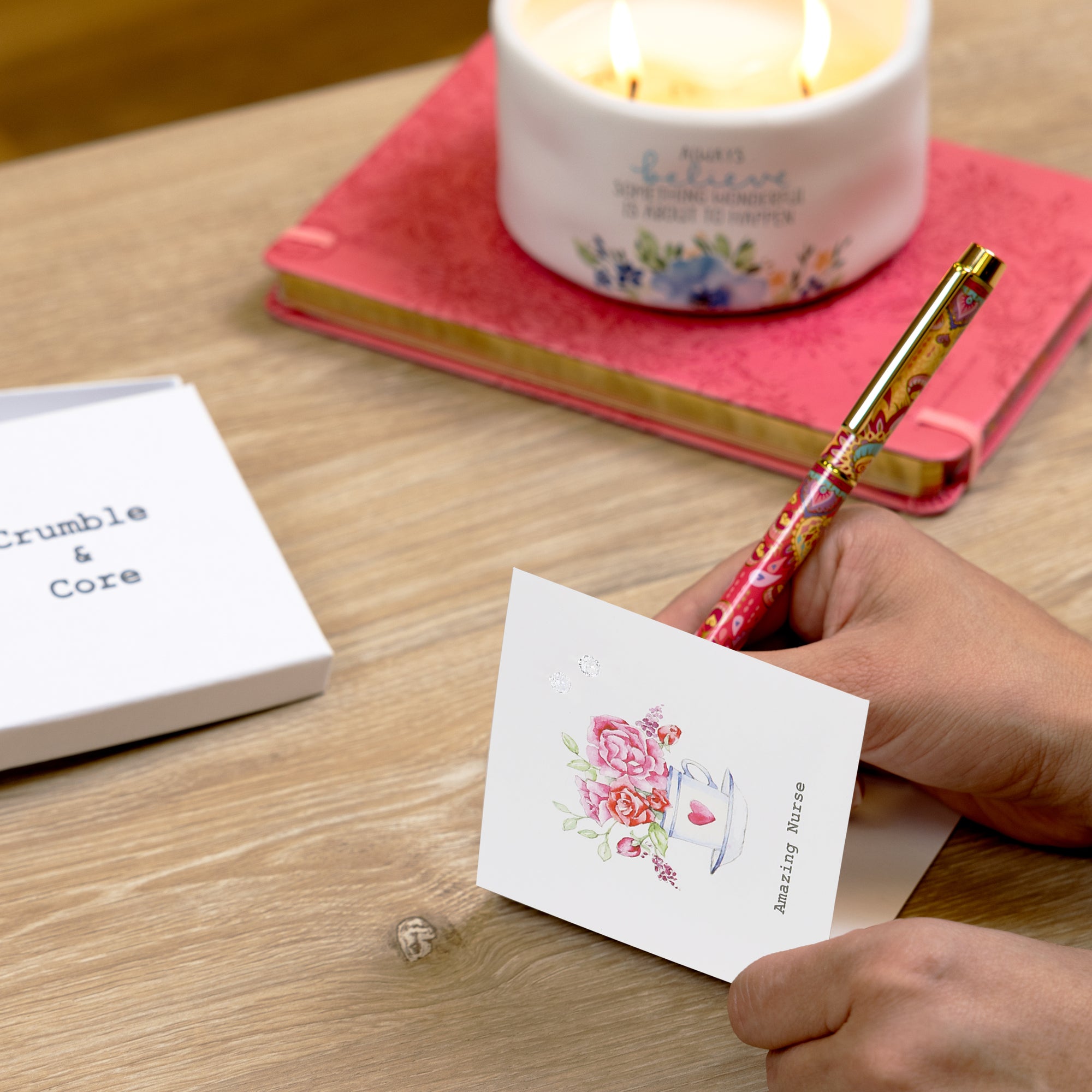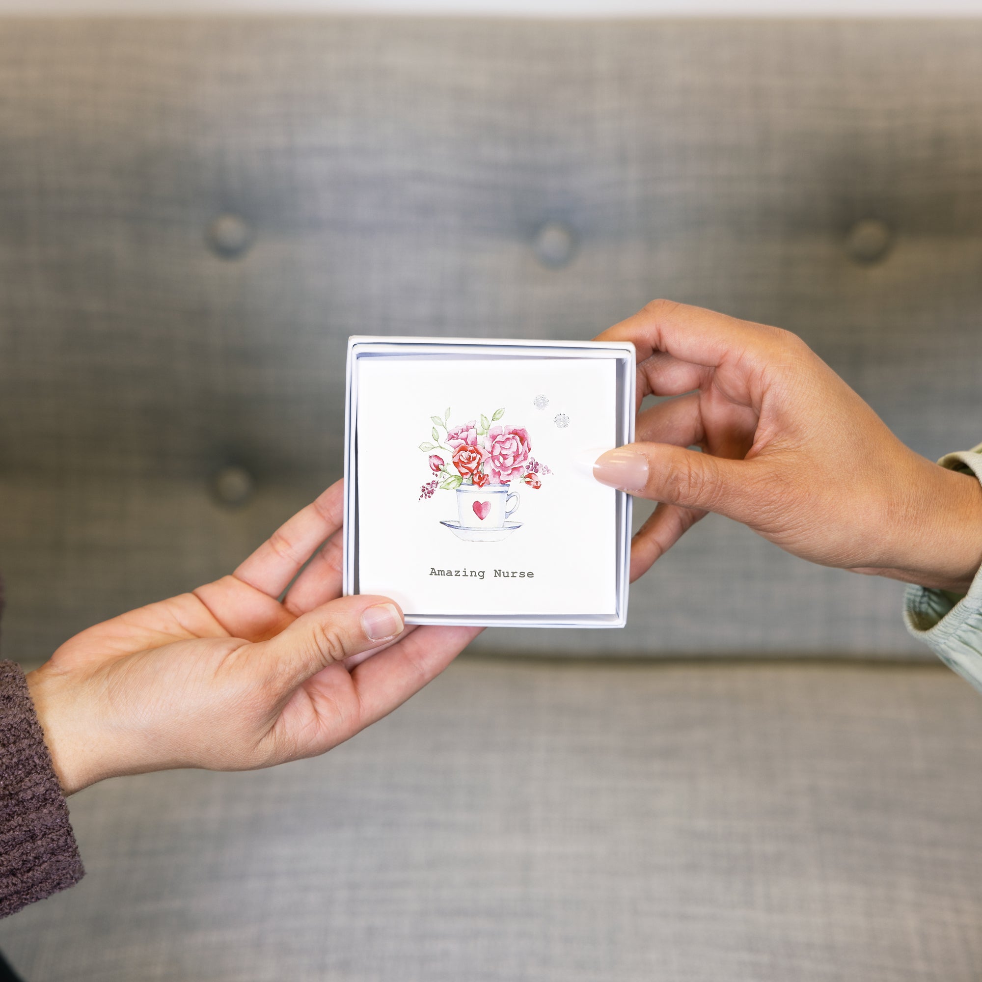 - IN-HOUSE DESIGN: The cheerful celebratory printed watercolored beautiful pink and red rose and heart teacup vase design with the earrings strategically placed within the florals. The typewritten style gray "Amazing Nurse" sentiment is placed below the celebratory printed format.