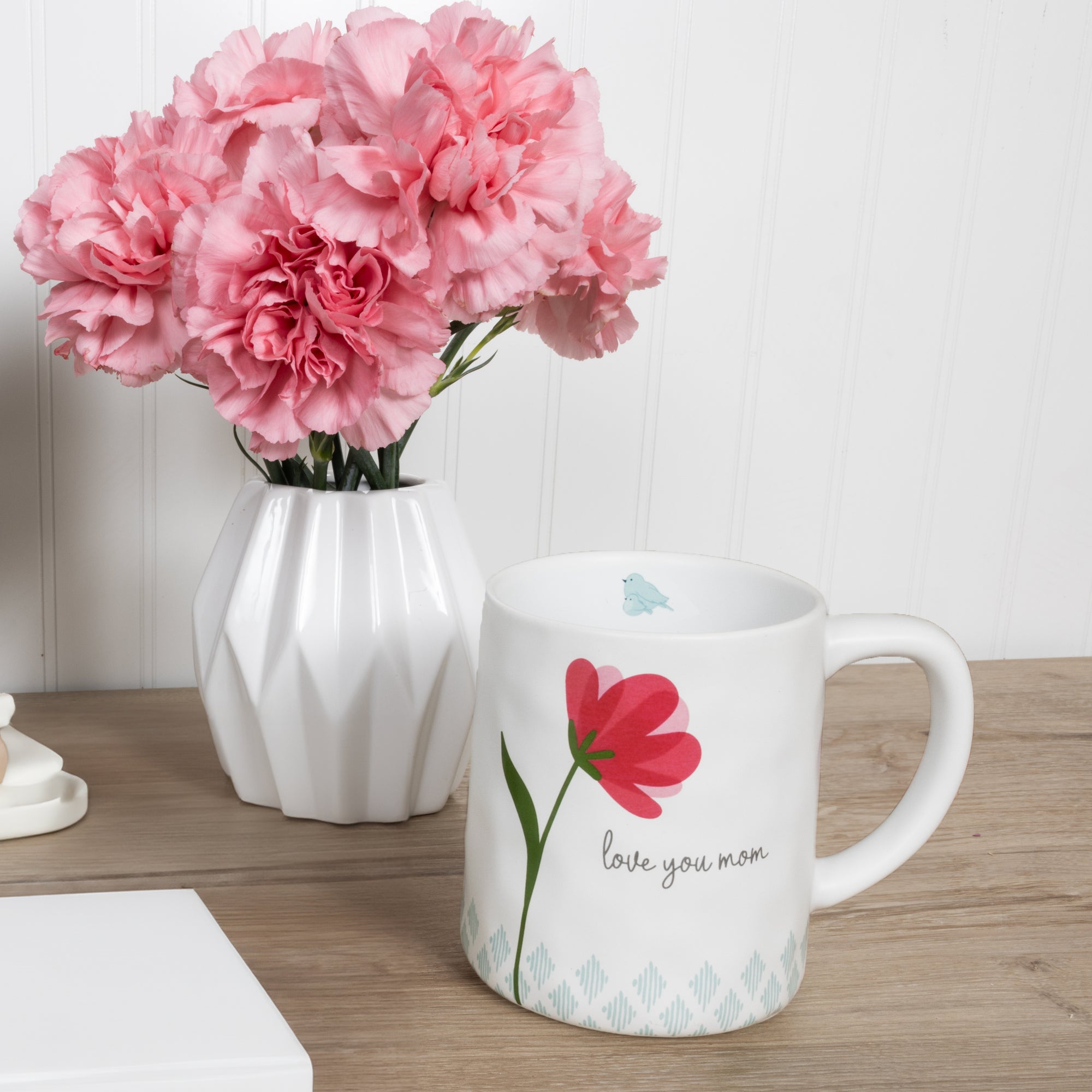 - IN-HOUSE DESIGN: The large pink flower is accompanied by a wrap-around diamond-shaped design that covers the bottom fifth of the drinkware. The gray cursive "Love You Mom" sentiment is on the front's center. The interior has a small blue bird on the brim.