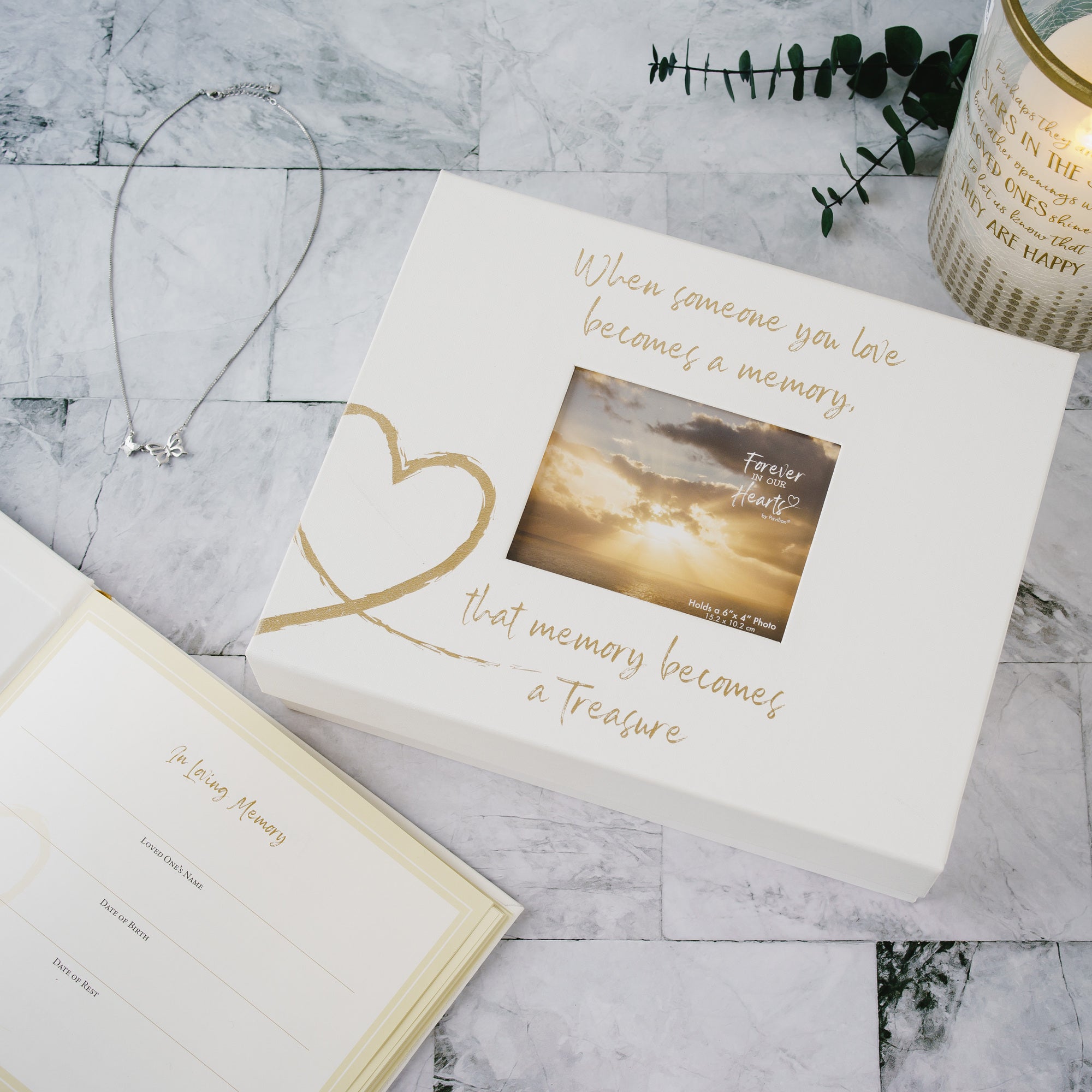- IN-HOUSE DESIGN: The top of box is printed in gold sentiment that reads "When someone you love becomes a memory, that memory becomes a treasure". The interior bottom features a gold printed heart with the saying, "Always and forever in our hearts." The box is collapsible for easy storage.