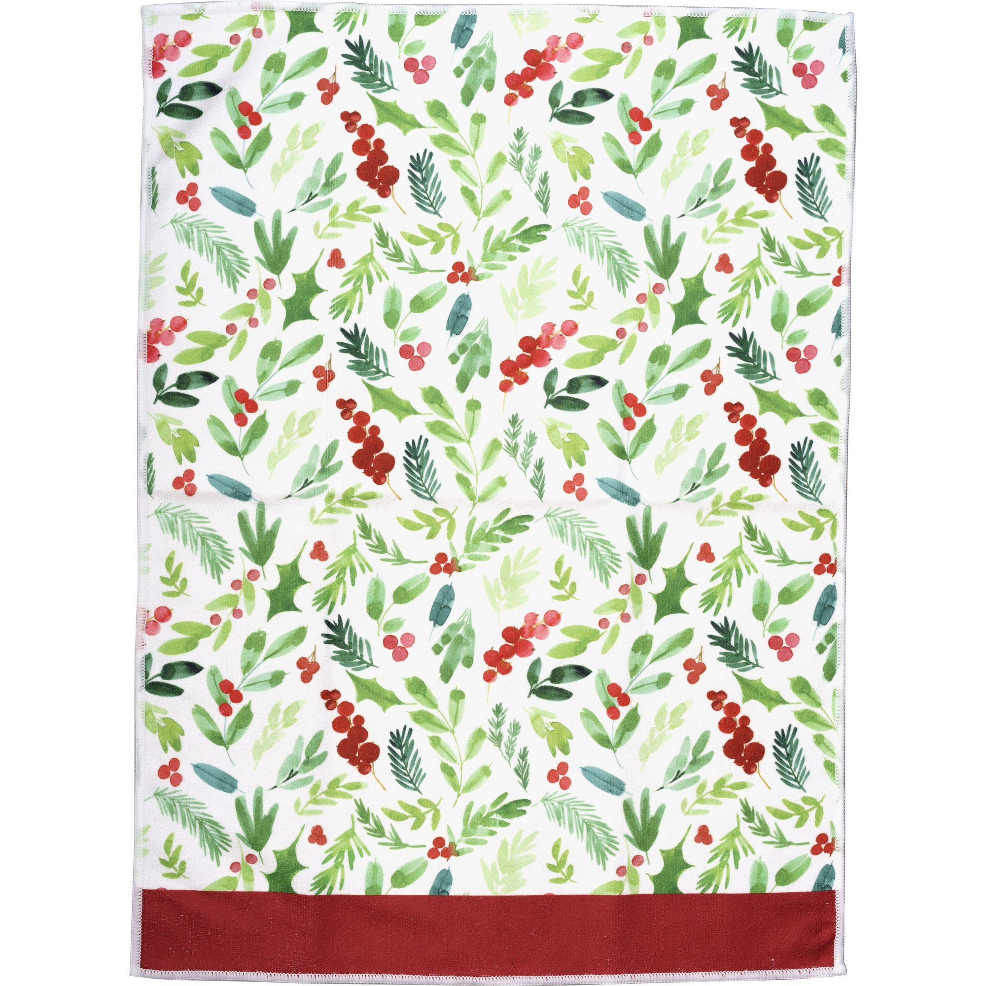 - IN-HOUSE DESIGN: Red and green watercolor paint-inspired striped and holly berry Christmas tree pattern is accompanied by gold "Happy Holidays" sublimation printed sentiment on the front side of one towel with a color-block red bottom. The other towel features an overall holly berry and pine leaf pattern with a color-block red bottom. The artwork was designed by artist Stephanie Ryan.