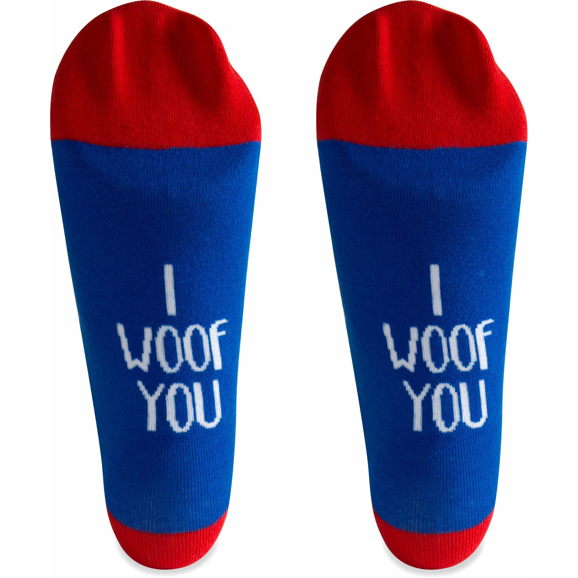 - IN-HOUSE DESIGN: "I Woof You" text is sewn into the base of each sock and a puppy icon is sewn into the top of each, alongside sewn-in "I & O" text.