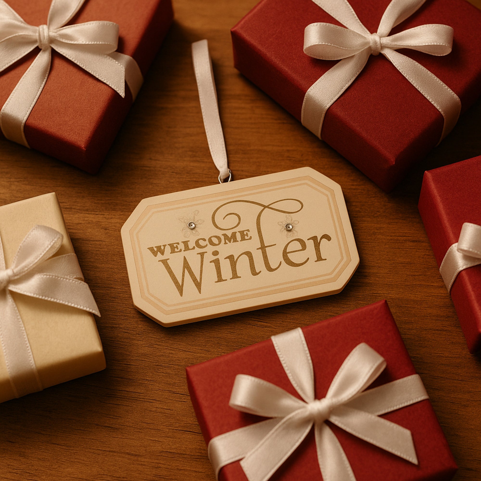 - IN-HOUSE DESIGN: "Welcome Winter" text and accompanying snowflake design are both printed onto the front of the plaque.