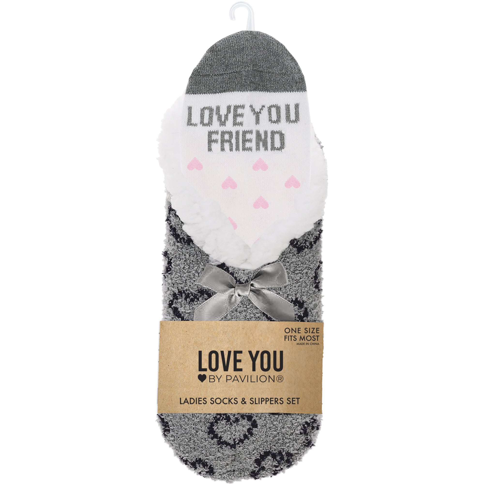 • IN-HOUSE DESIGN: The set features a heartfelt “Love You Friend” sentiment woven into the design, reminding your best friend of how much you care. The socks are decorated with an adorable heart pattern in soft pink, while the slippers include a matching heart motif and bow accent, making the set both visually appealing and meaningful. These charming details, combined with the anti-slip bottom, make it a stylish and practical choice for daily wear.