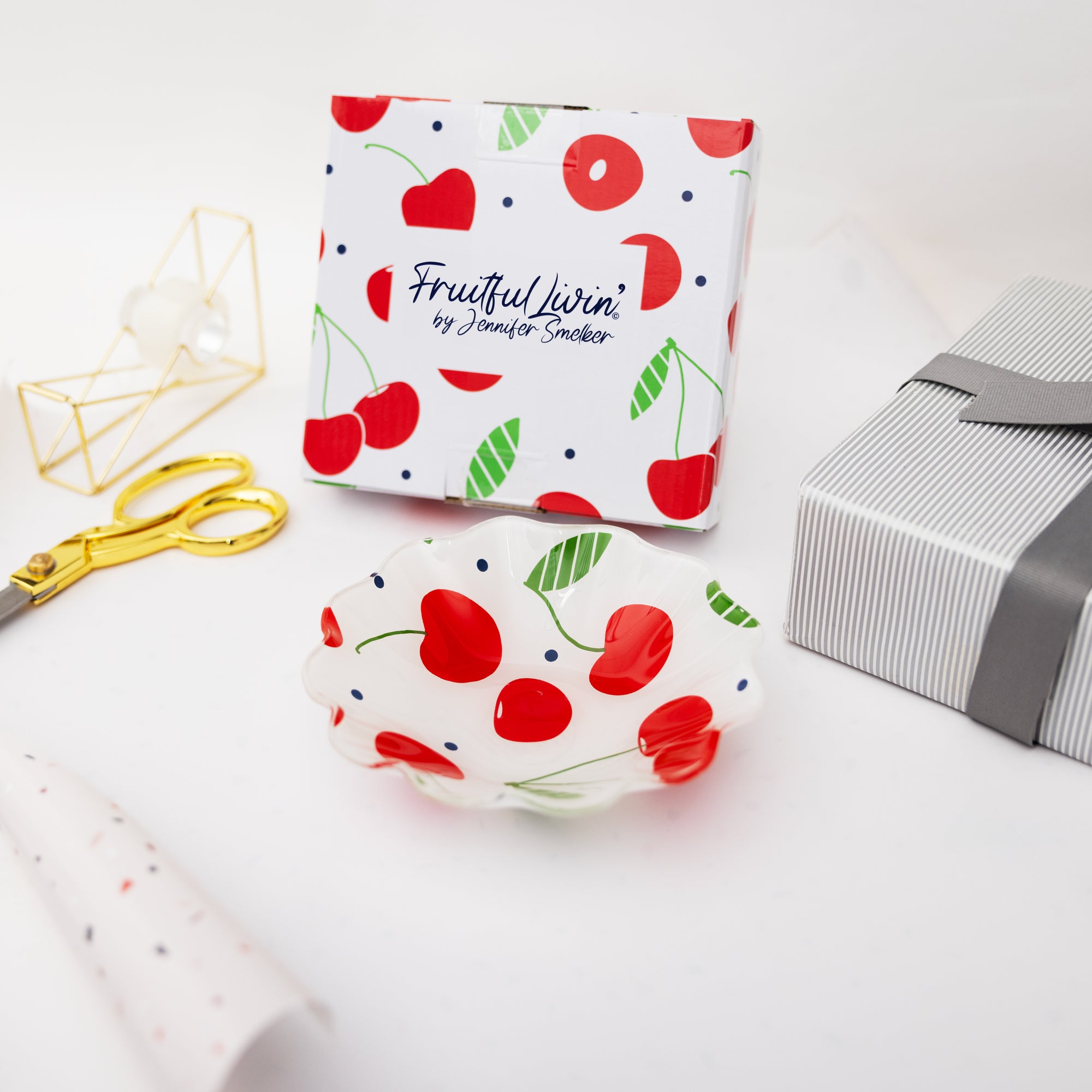 - IN-HOUSE DESIGN: Large and bold green-stemmed red cherries accompany blue polka dots on a white background.