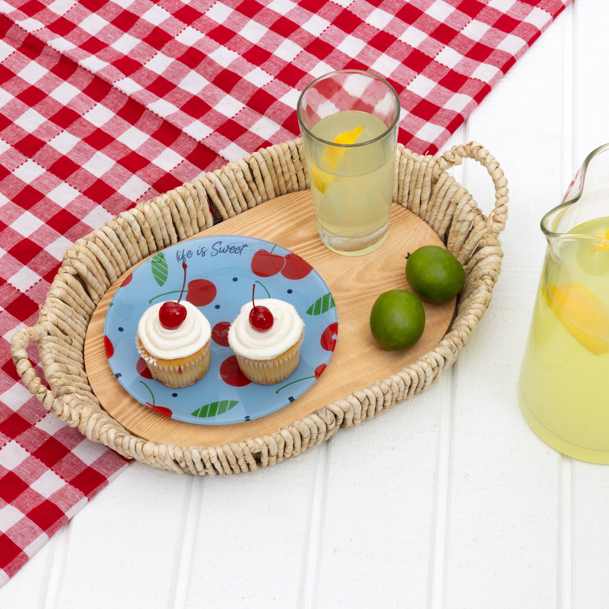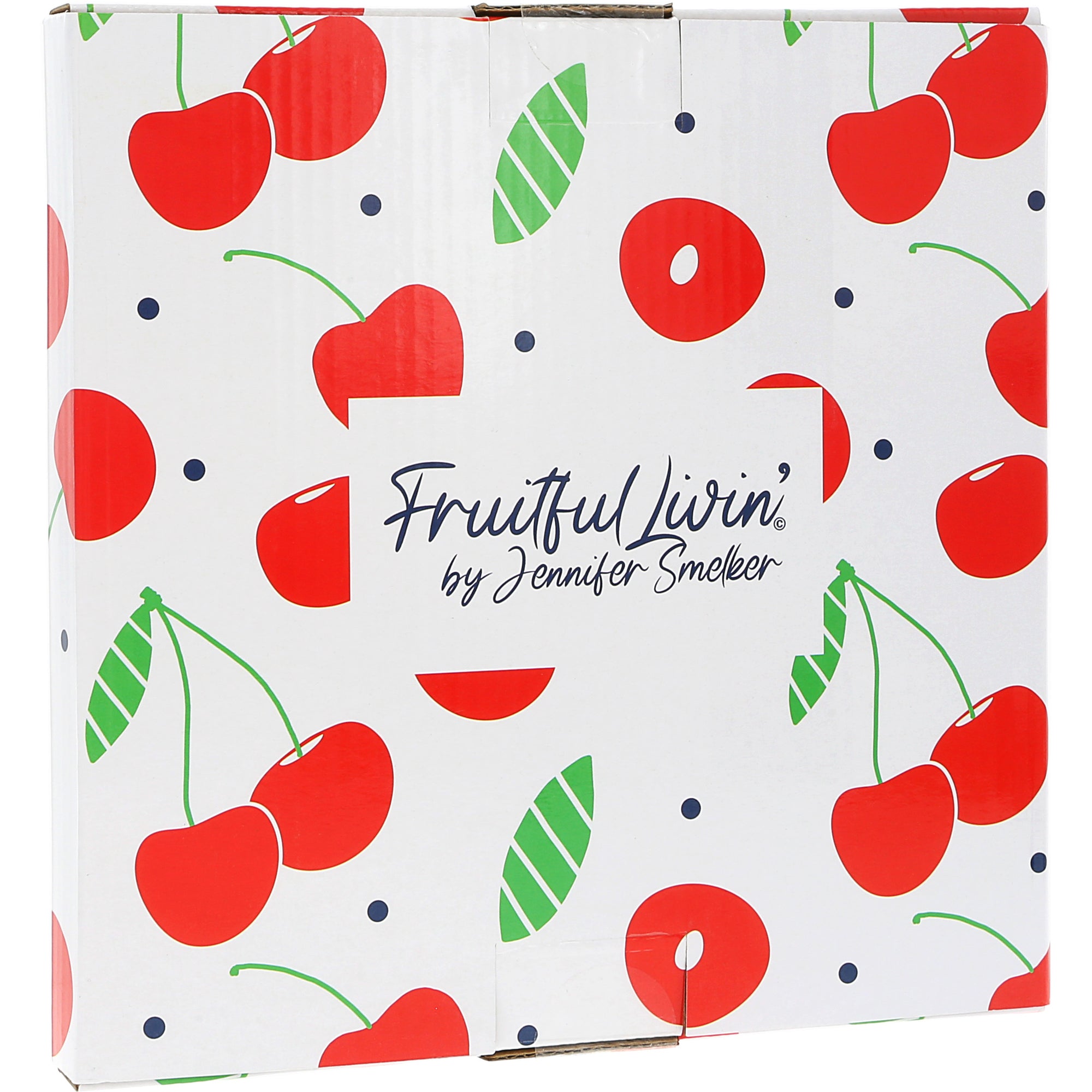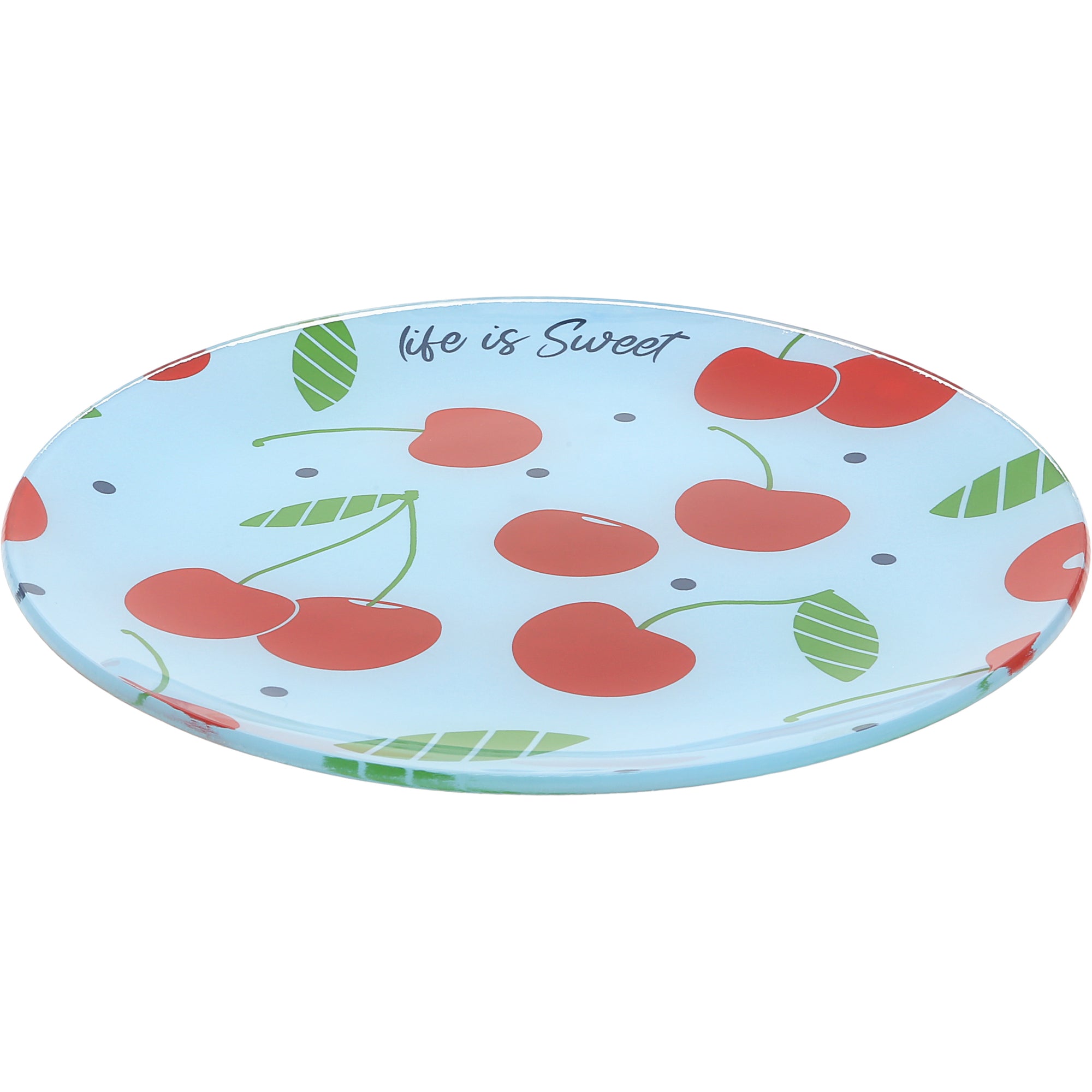 - IN-HOUSE DESIGN: The blue background encompasses red cherries with green stems accompanied by blue polka dots. The "Life Is Sweet" sentiment is on the rim of the appetizer plate.