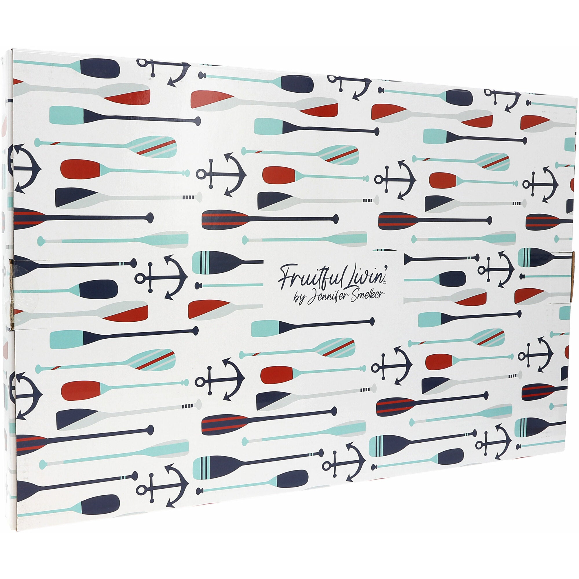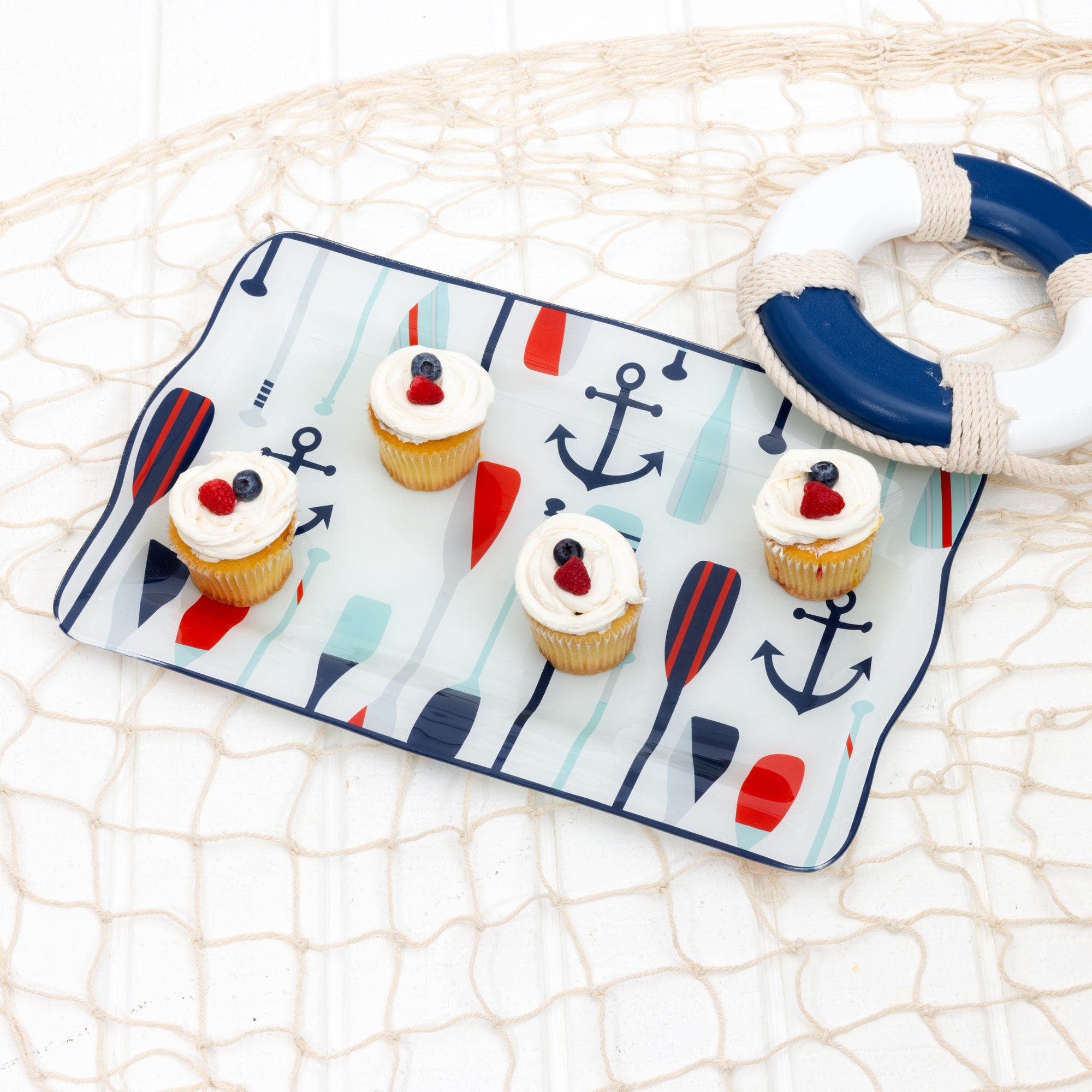 • IN-HOUSE DESIGN: The edges of the tray have a blue outline, whereas the background of the tray is white. Staggering anchors and striped patterned gray, red, and blue oars fill the tray.