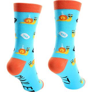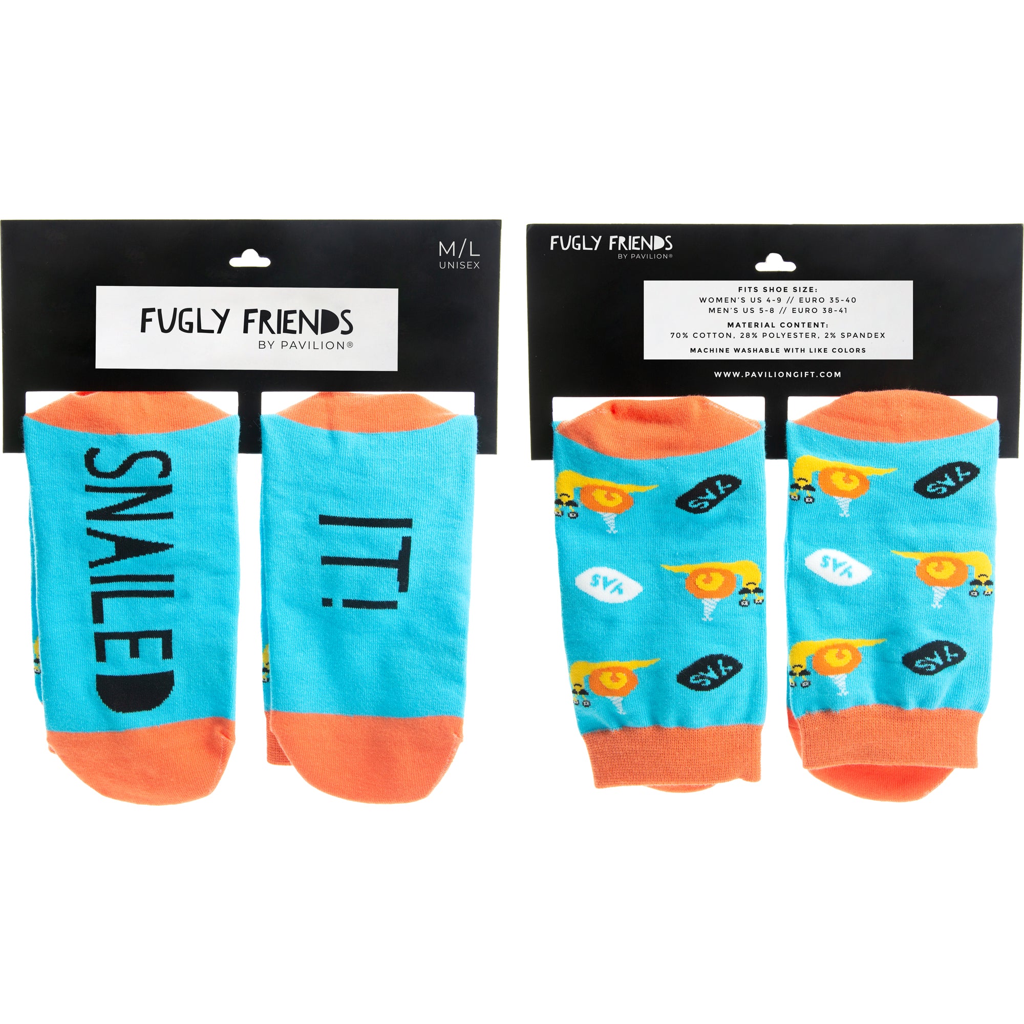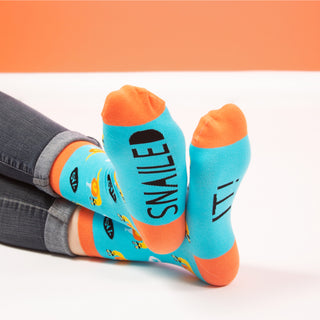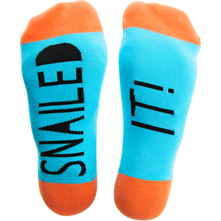 - IN-HOUSE DESIGN: "Snailed It" text is sewn into the base of the socks and is accompanied by a snail pattern with "YAS" text.