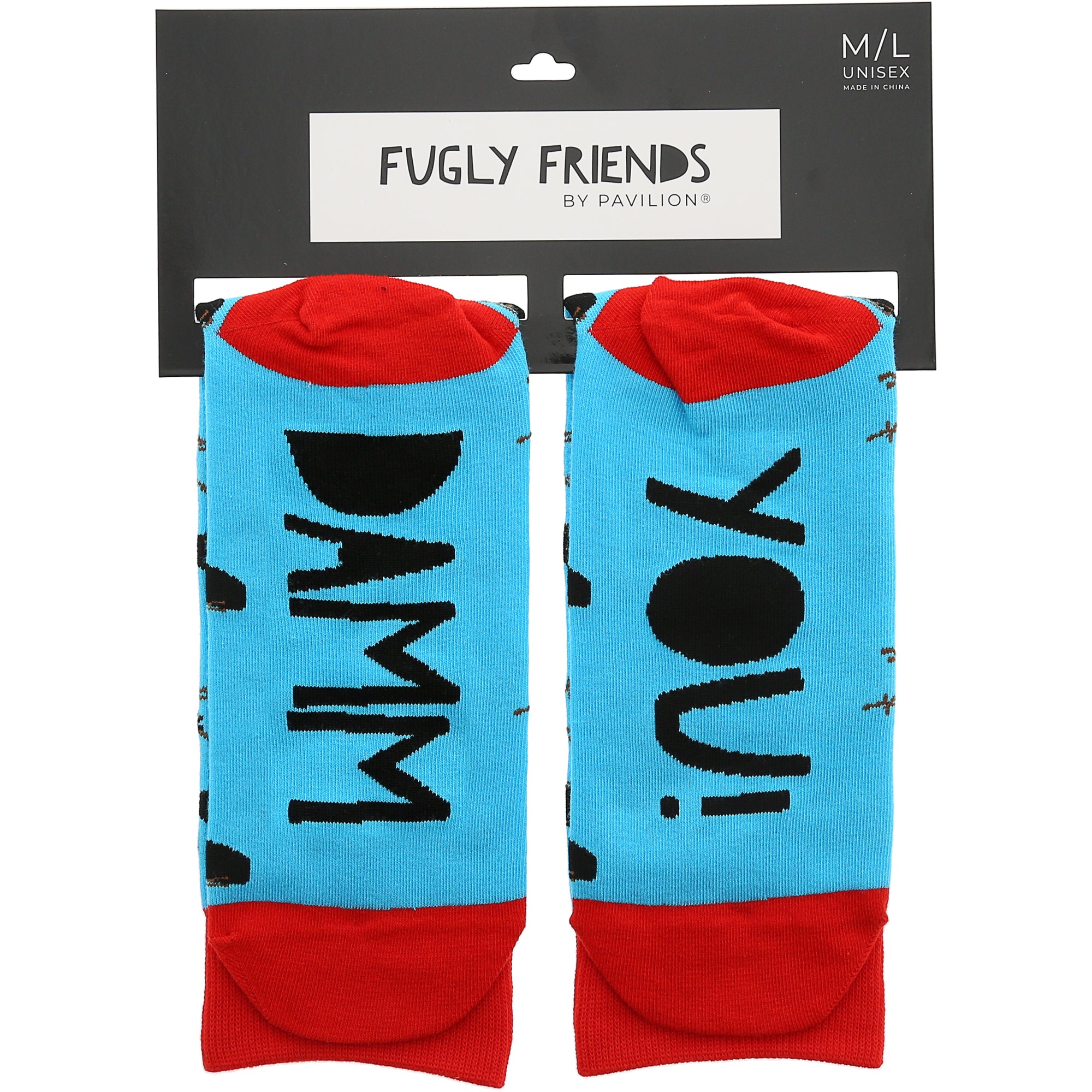 • IN-HOUSE DESIGN: Red ankle, heel, and toes are attached to an overall blue body. The angry beaver characters are wearing red bow ties and holding brown logs—repetitive black speech bubbles with "HOT DAMM" in blue font. One sock bottom has "DAMM" sentiment while the opposite sock has "YOU!" sentiment in black.