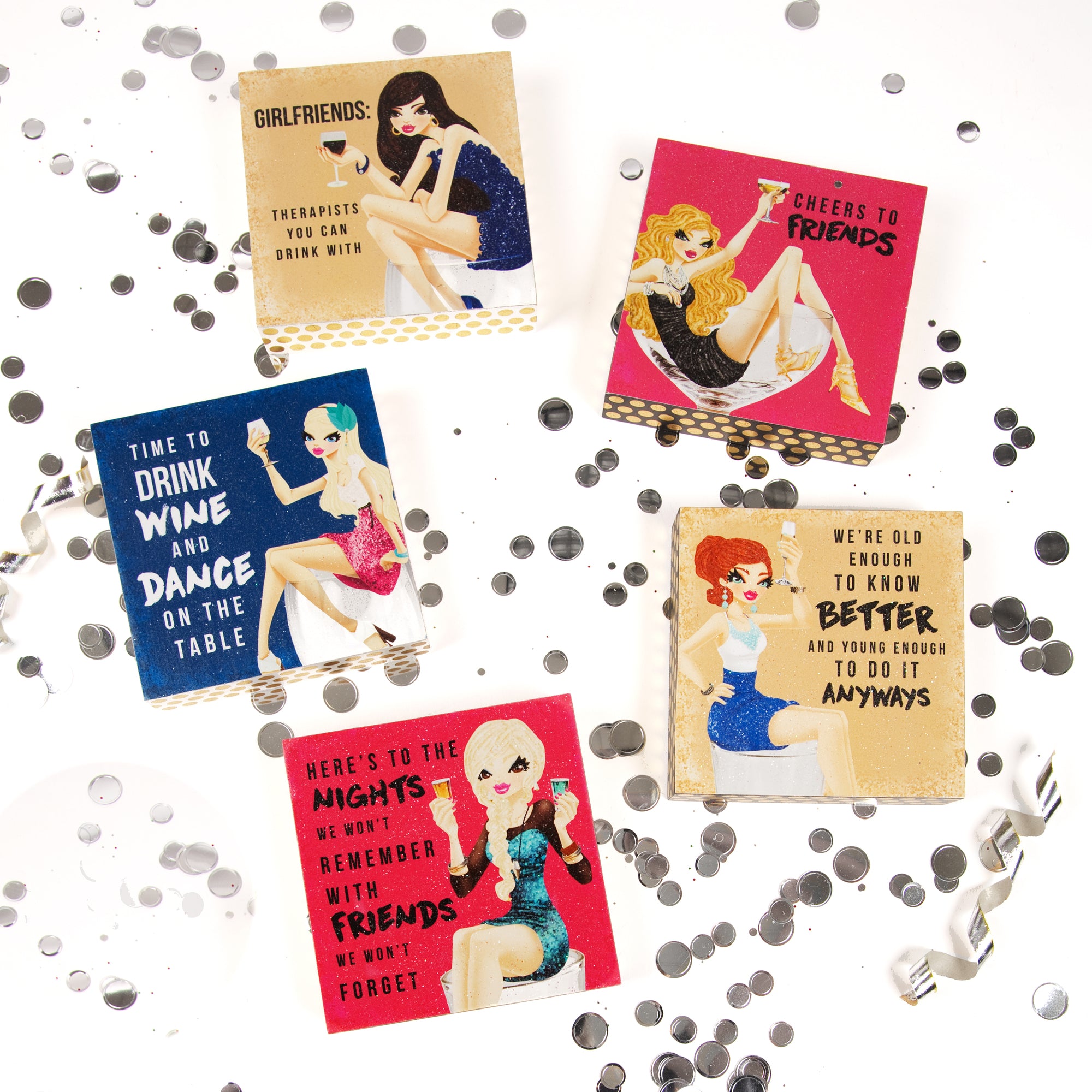 • IN-HOUSE DESIGN: "Time To Drink Wine And Dance On The Table" text and girl image are both printed onto the front of the plaque.