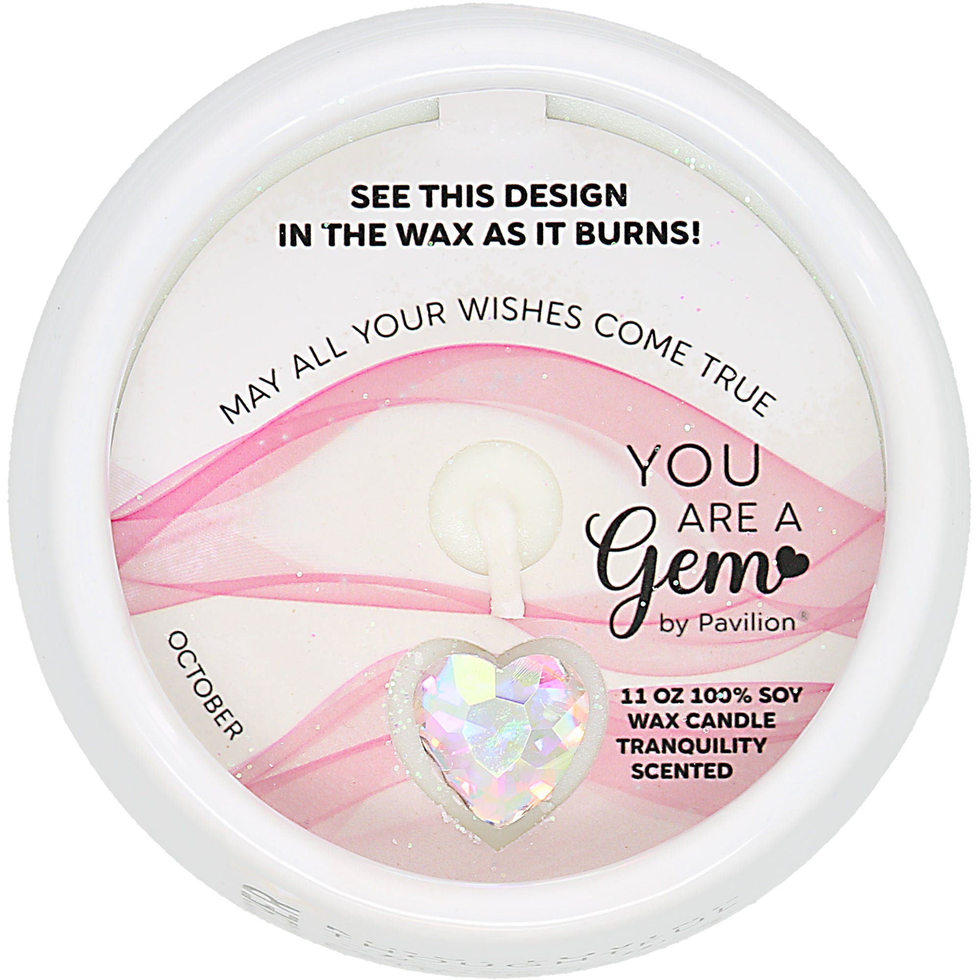 • IN-HOUSE DESIGN: Silver "October" sentiment lines the left side under the heart accompanied by black "Kind, Loving, Thoughtful, Always Full Of Encouragement, Fair, Honest, Intelligent, You Are A Gem: Opal" wording to the right, which is centered on the container. The heart inside is iridescent, and the wax reveals a flowy fabric-like pink image with "May All Your Wishes Come True" wording. The wax reveal begins to show after 10 minutes and is fully visible after 50 minutes of burn time. Overall burn time is 27-30 hours. Always remember to trim your wick down after each burn.