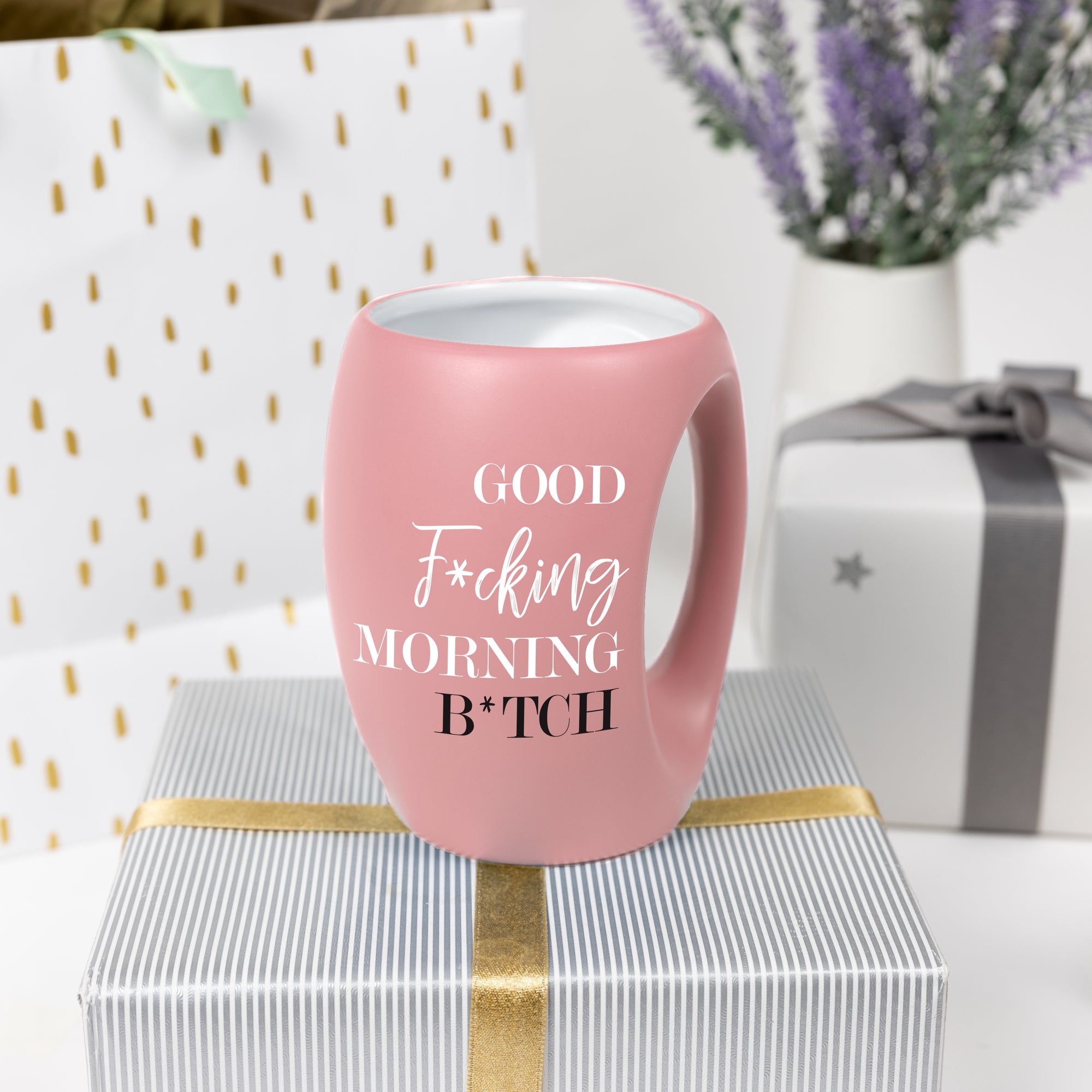 - IN-HOUSE DESIGN: Featuring a bold white and black "Good F*cking Morning B*tch" sentiment on a purply pink matte background, this mug brings humor and charm to your morning routine. The interior of the cup is finished with a glossy white glaze, ensuring it’s Prop 65 food-safe, while the modern design effortlessly blends with any kitchen collection, combining contemporary aesthetics with a touch of playful sarcasm.