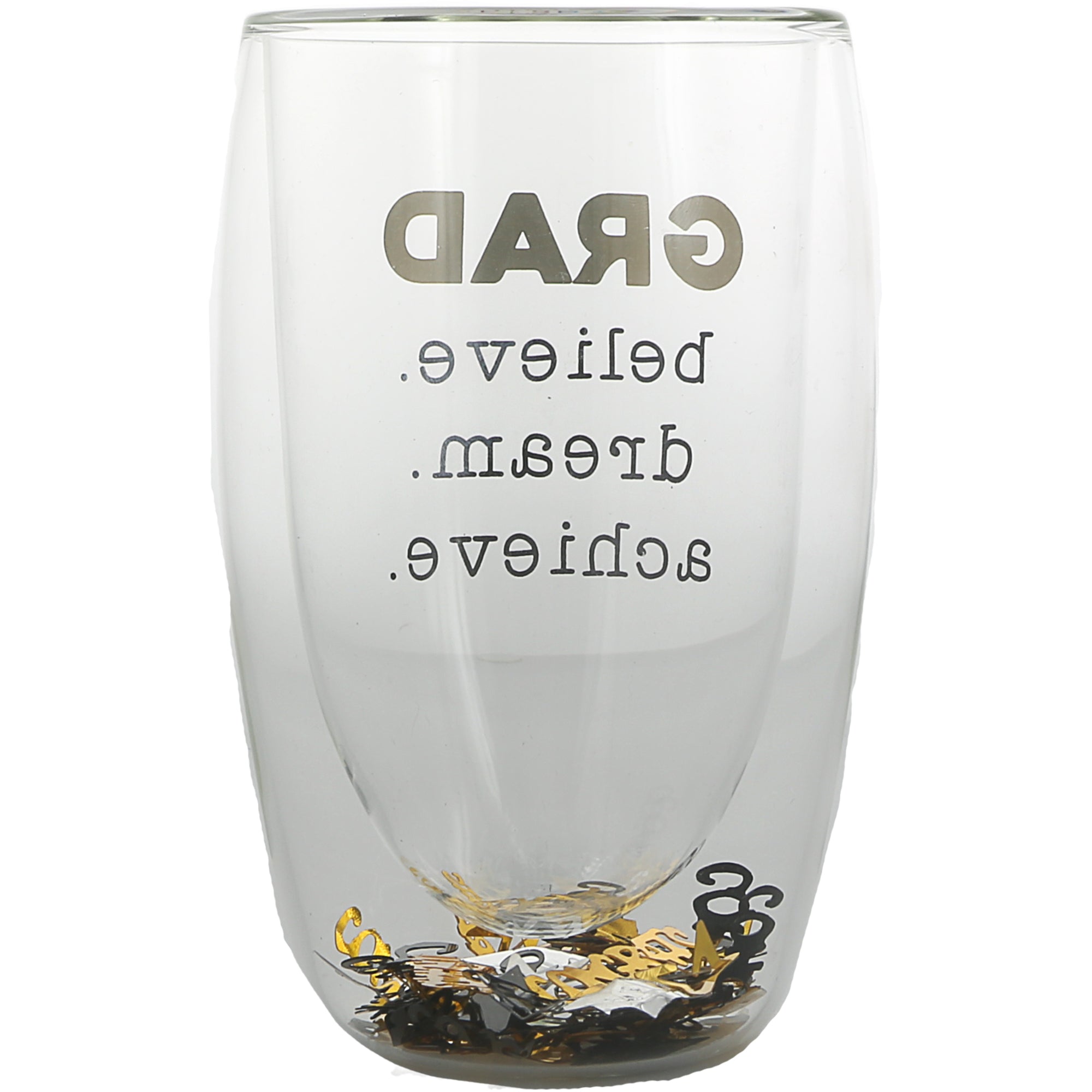 - IN-HOUSE DESIGN: The front of the glass has a gold and black sentiment, "Grad: Believe. Dream. Achieve." The confetti is the shapes of stars, diplomas, graduation caps, and "Grad" & "Congrats" sentiments in varying colors.