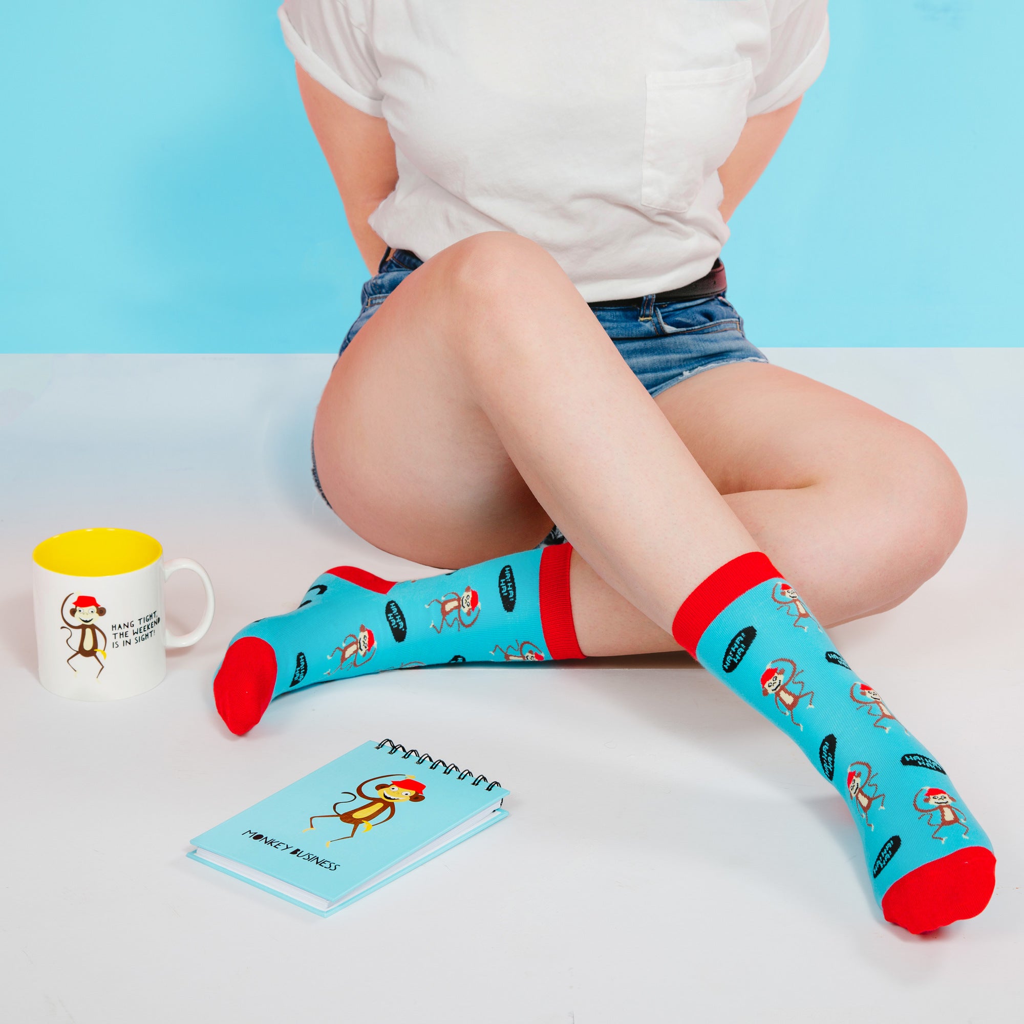 - IN-HOUSE DESIGN: "Going Bananas" text is sewn into the base of the socks and is accompanied by a monkey pattern with "Ha! Ha! Ha!" text.