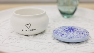 • PREMIUM QUALITY: This 3.5" x 3.5" x 2.25" white matte exterior & interior body/blue glossy lid has a damask pattern modern-styled stoneware keepsake box that is the perfect size for holding small delicate jewelry items, including rings, earrings, necklaces, and bracelets. Can keep desk items such as paper clips or push pins secure. Even use for cotton balls, Q-tips, toothpicks, bobby pin holders, and coin and change holders. The round-shaped container has a lid that is easy to lift on and off the base with a lipped edge that will keep the top from sliding off.