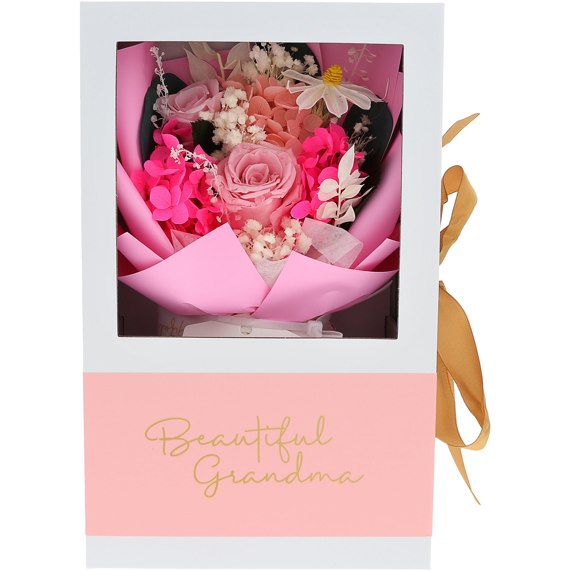 - IN-HOUSE DESIGN: This bouquet, designed by Pavilion’s in-house team, showcases an arrangement of pink and white flowers chosen to symbolize love, warmth, and wisdom. The sentiment "Beautiful Grandma" is written in a graceful, gold font on the front of the box, adding an extra layer of appreciation for grandmothers who have filled our lives with joy. Each element of this bouquet is carefully crafted to create a heartwarming tribute to grandmothers.