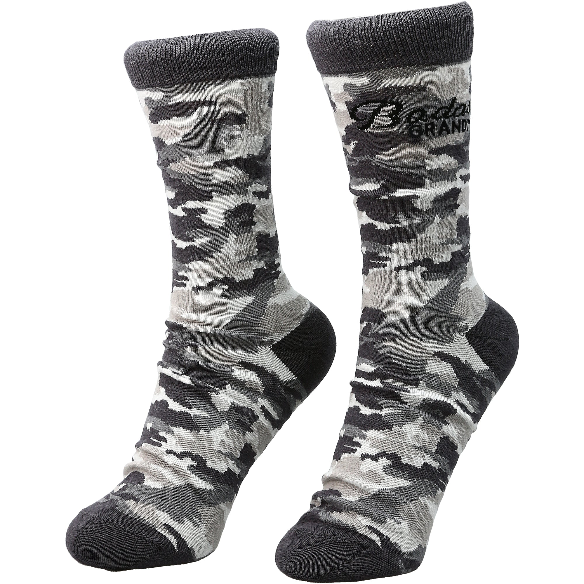 - IN-HOUSE DESIGN: "Badass Grandma" is sewn into the outside upper of the crew socks on both socks in black. Ankle, heel & toe are a solid gray color. At the same time, the body combines four different gray tones that make up a camo pattern.