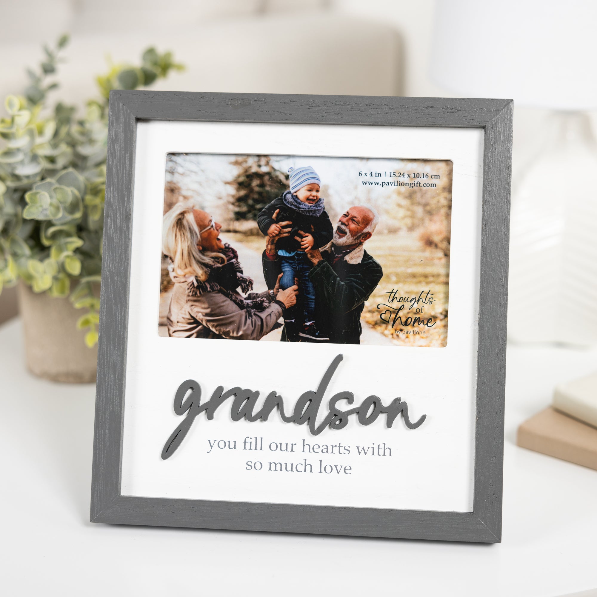 • PREMIUM QUALITY: This 7.75” x 8.25” MDF frame features a soft white and gray finish, blending style and durability. The bold "Grandson" cut-out adds depth, while the phrase “you fill our hearts with so much love” is printed below. Designed for a 4” x 6” horizontal photo behind glass, it protects against wear. Plastic tabs on the back make photo swaps easy, and the metal sawtooth hanger allows for wall display or shelf placement.