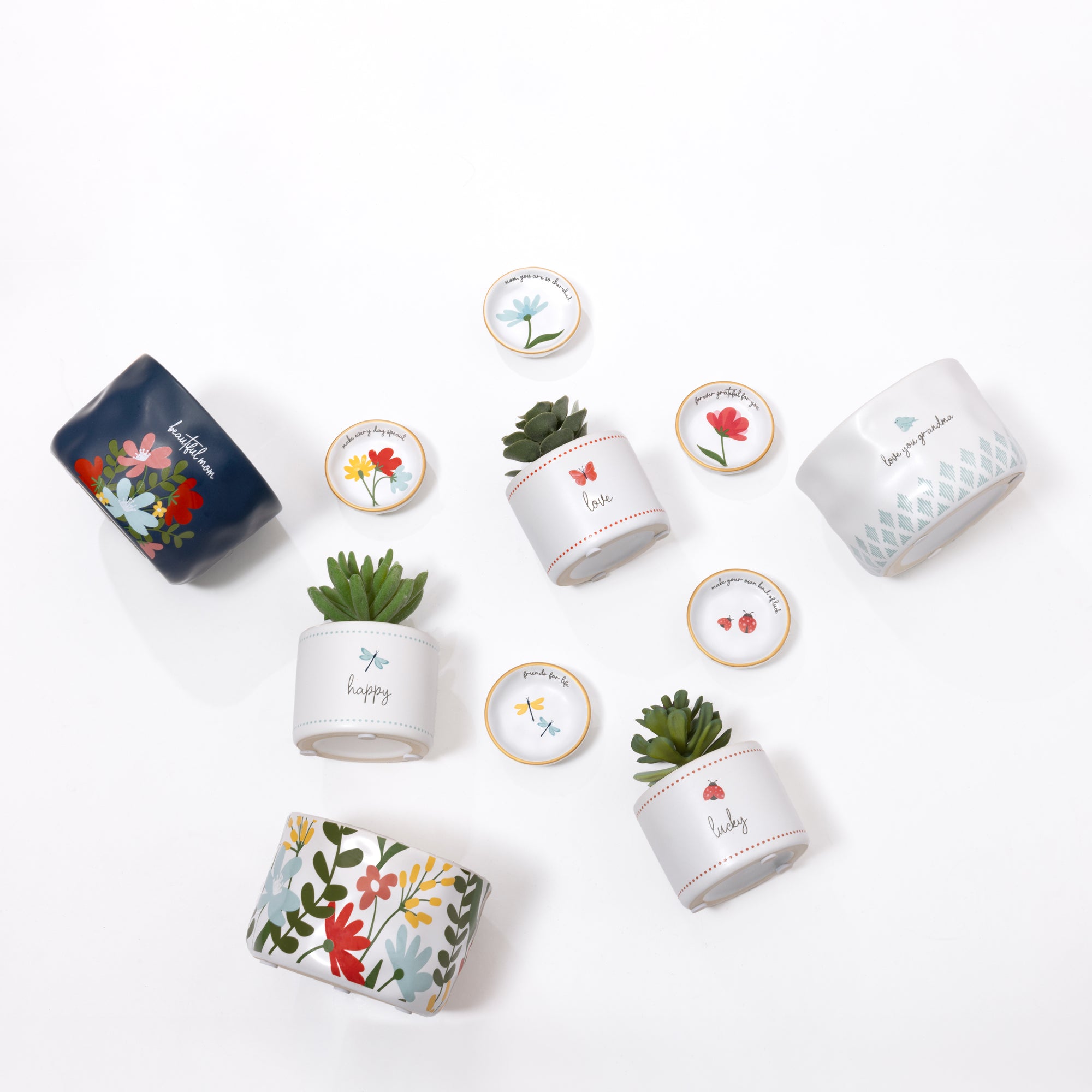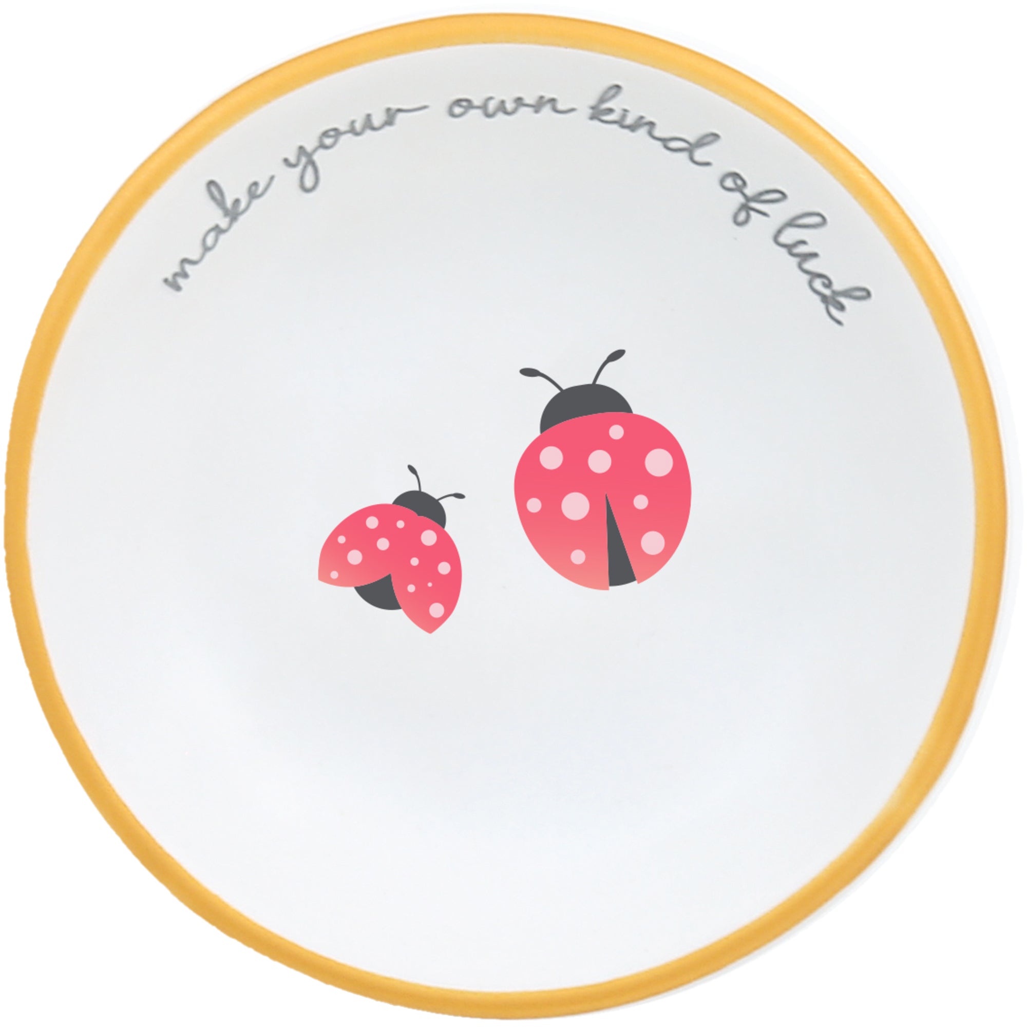 - IN-HOUSE DESIGN: The finish is matte white with a metallic gold brim. The gray "Make Your Own Kind Of Luck" glossy risen sentiment wraps around the interior edge. The bottom of the dish has a large and small set of ladybugs.