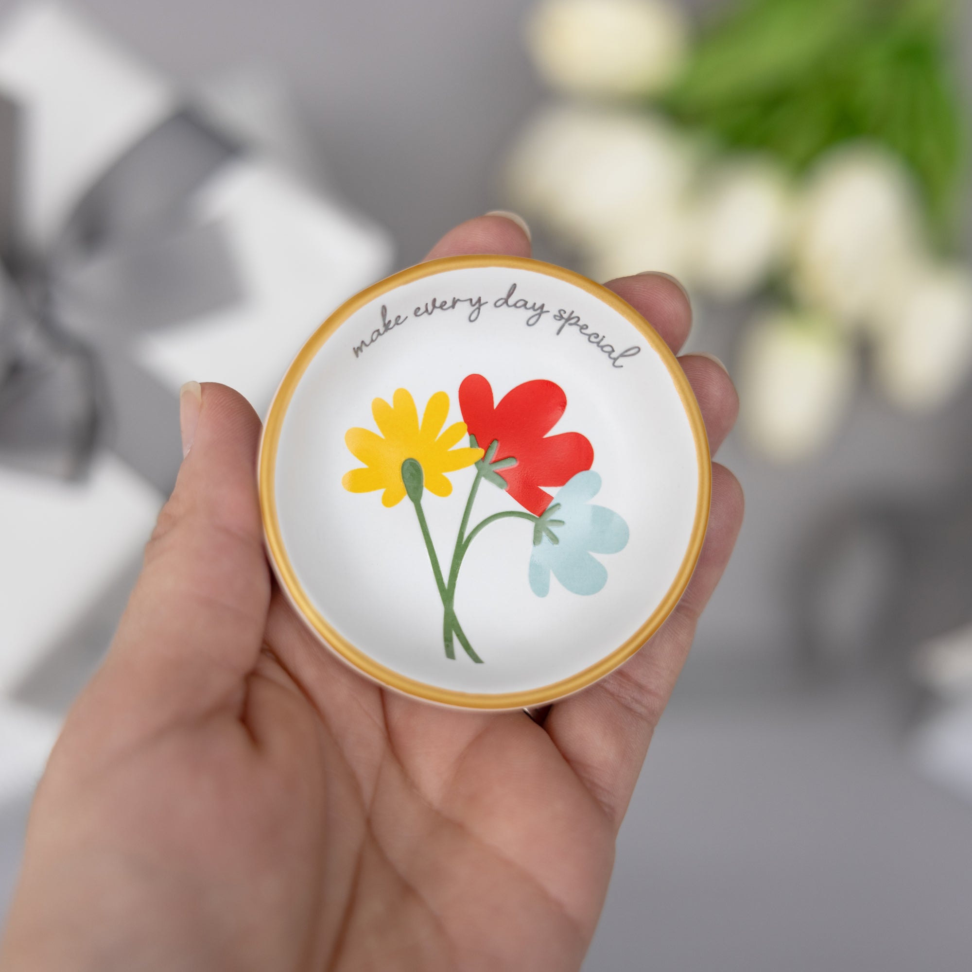 - IN-HOUSE DESIGN: The finish is matte white with a metallic gold brim. The gray "Make Every Day Special" glossy risen sentiment wraps around the interior edge. The bottom of the dish three large yellow, red, and blue flowers.