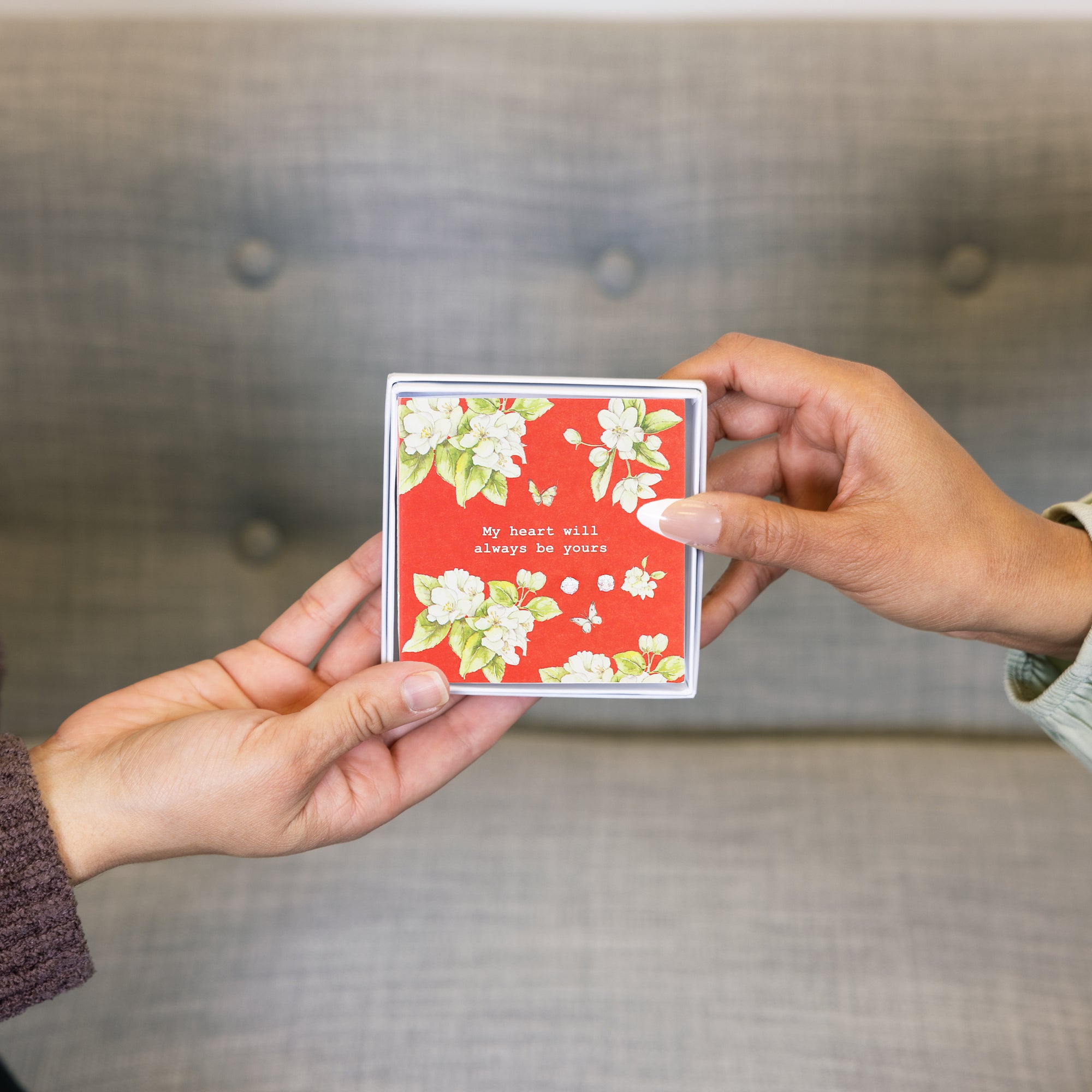 - IN-HOUSE DESIGN: The printed card has a red background and a beautiful magnolia floral and butterfly design. The earrings are strategically placed within the florals. The typewritten white "My Heart Will Always Be Yours" sentiment is placed in the center of the greeting card.