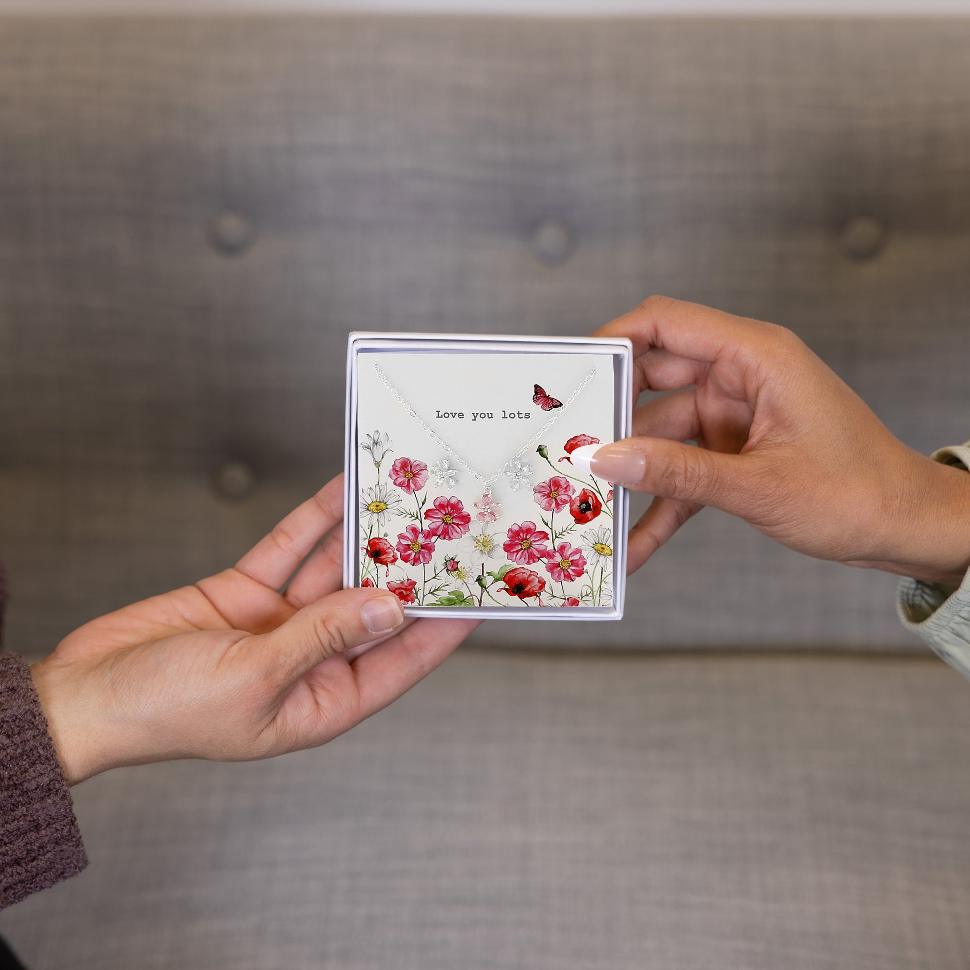 - PREMIUM QUALITY: This 3.25" x 3.25" greeting card and jewelry set includes a pair of 10mm silver-plated cubic zirconia flower stud earrings and a matching 16.5"-18.5" adjustable necklace. Made from premium materials, each piece adds a special sparkle to any friendship. Packaged with care in a branded gift box with cotton padding, it’s a ready-to-gift keepsake that symbolizes connection and loyalty.