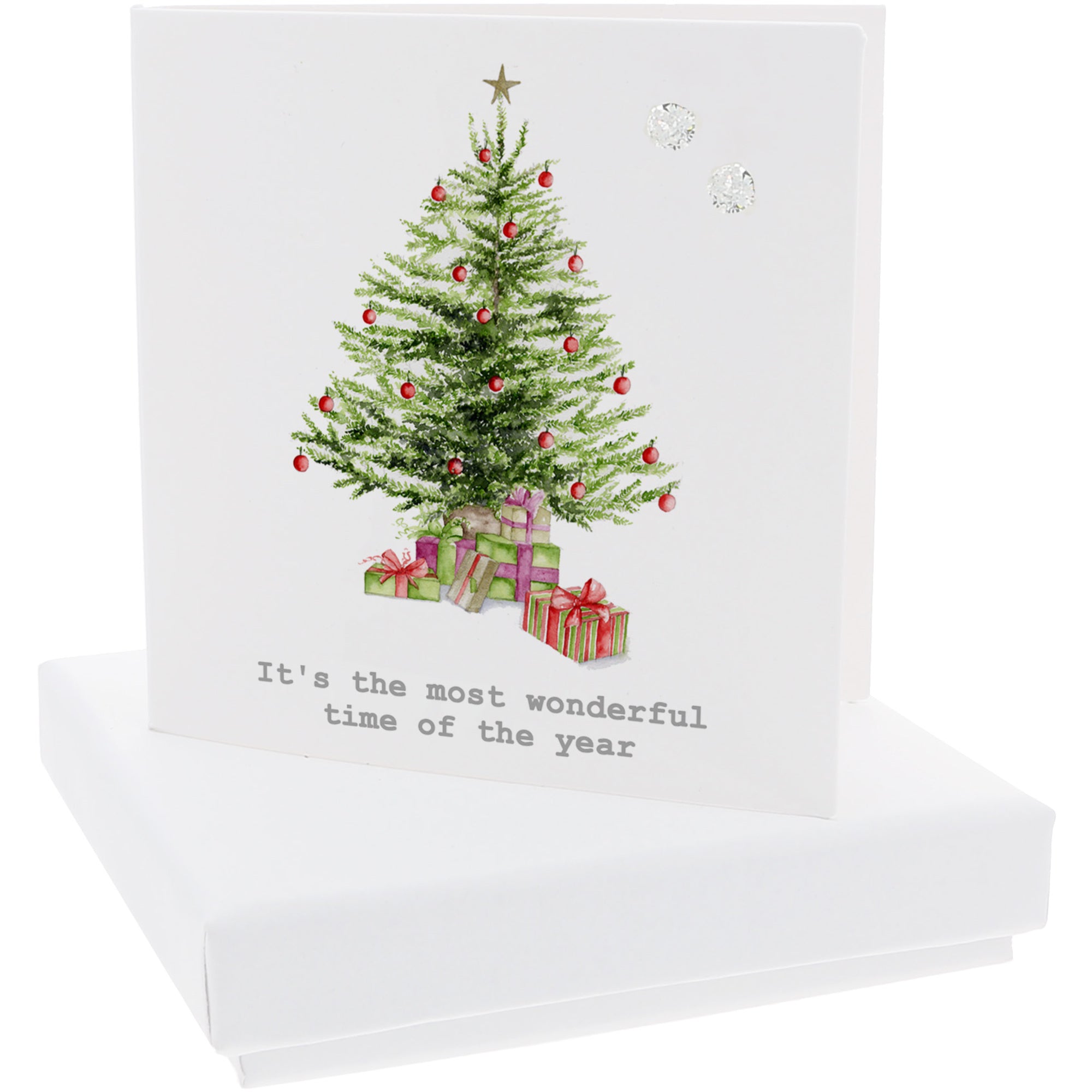 - IN-HOUSE DESIGN: The ornament and star-decorated pine tree holds presents beneath it. The typewritten style gray "It's The Most Wonderful Time Of The Year" sentiment is placed below the celebratory printed design, whereas the earring is placed in the upper right-hand corner of the card.