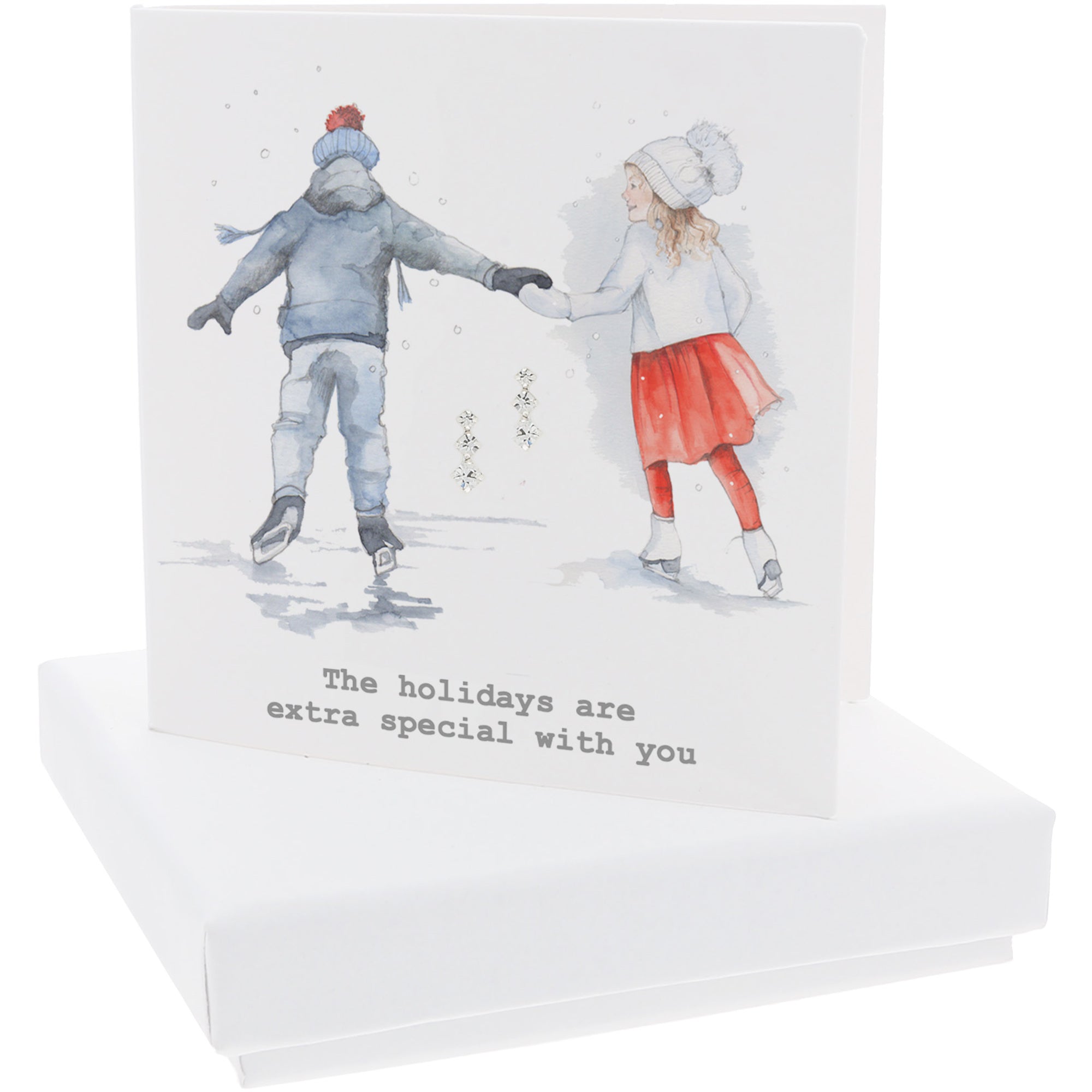 - IN-HOUSE DESIGN: The chilled couple holds hands, ice skates, and bundles up with the typewritten style gray "The Holidays Are Extra Special With You" sentiment below, whereas the earring is placed in the center of the card.