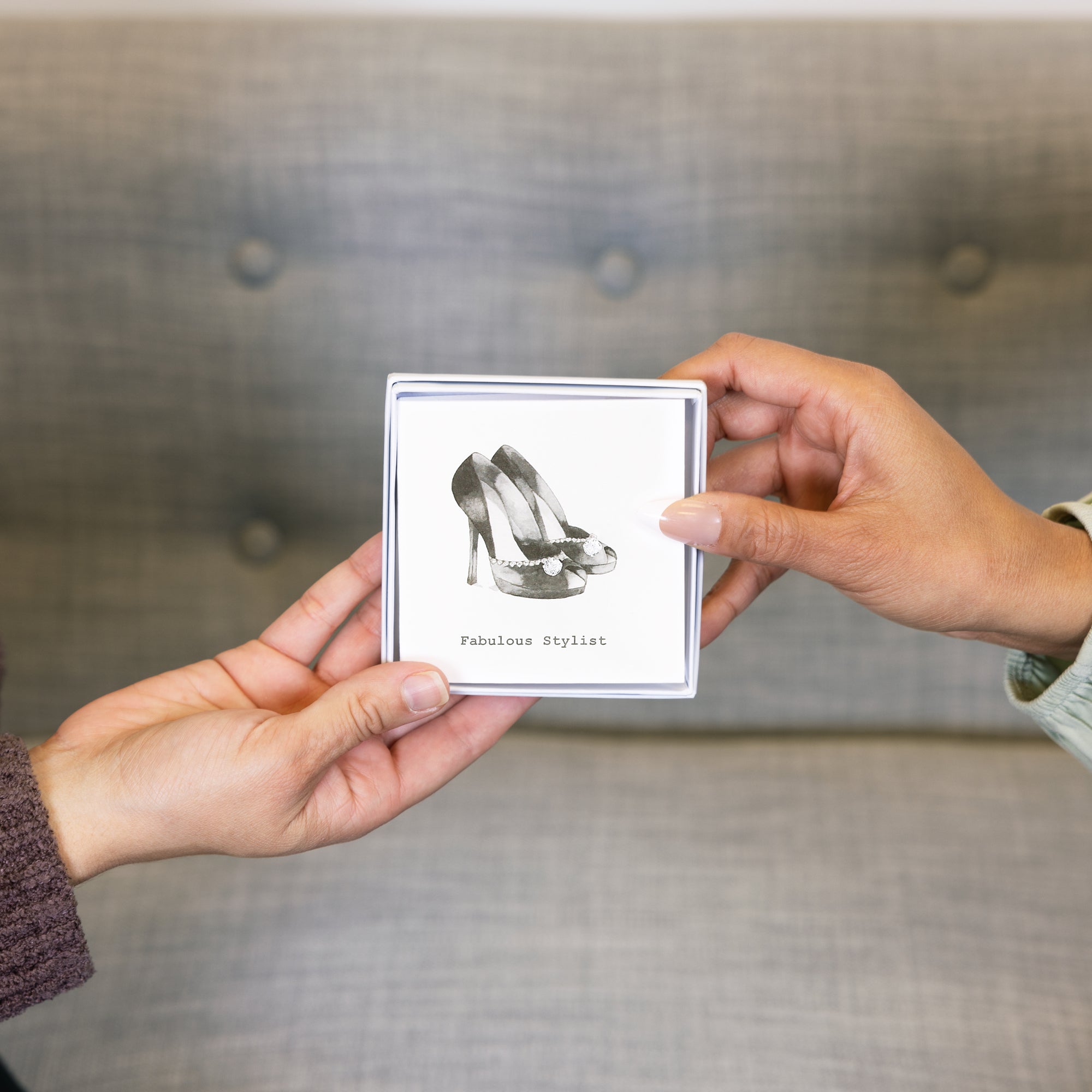 - IN-HOUSE DESIGN: The printed watercolored black heel design with the earrings strategically placed on the shoes. The typewritten style gray "Fabulous Stylist" sentiment is placed below the heels.