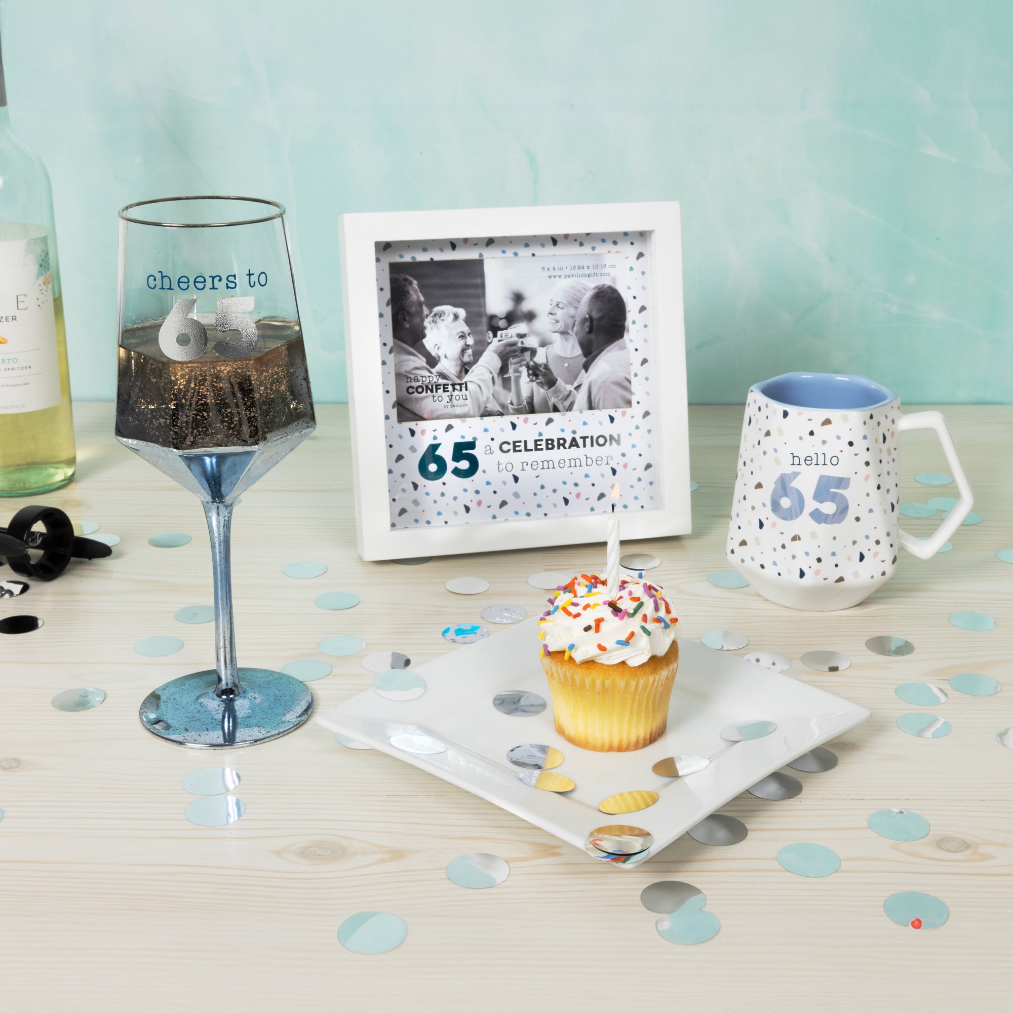 - IN-HOUSE DESIGN: This glass features a stunning blue mirror metallic effect that fades into a clear upper portion, accented by glossy decals and a "Cheers to 65" sentiment. The metallic rim and gradient create a refined, polished look, making it perfect for any table or bar setup. With its detailed design and balanced stem, this glass is both a functional piece and a stylish display when not in use.