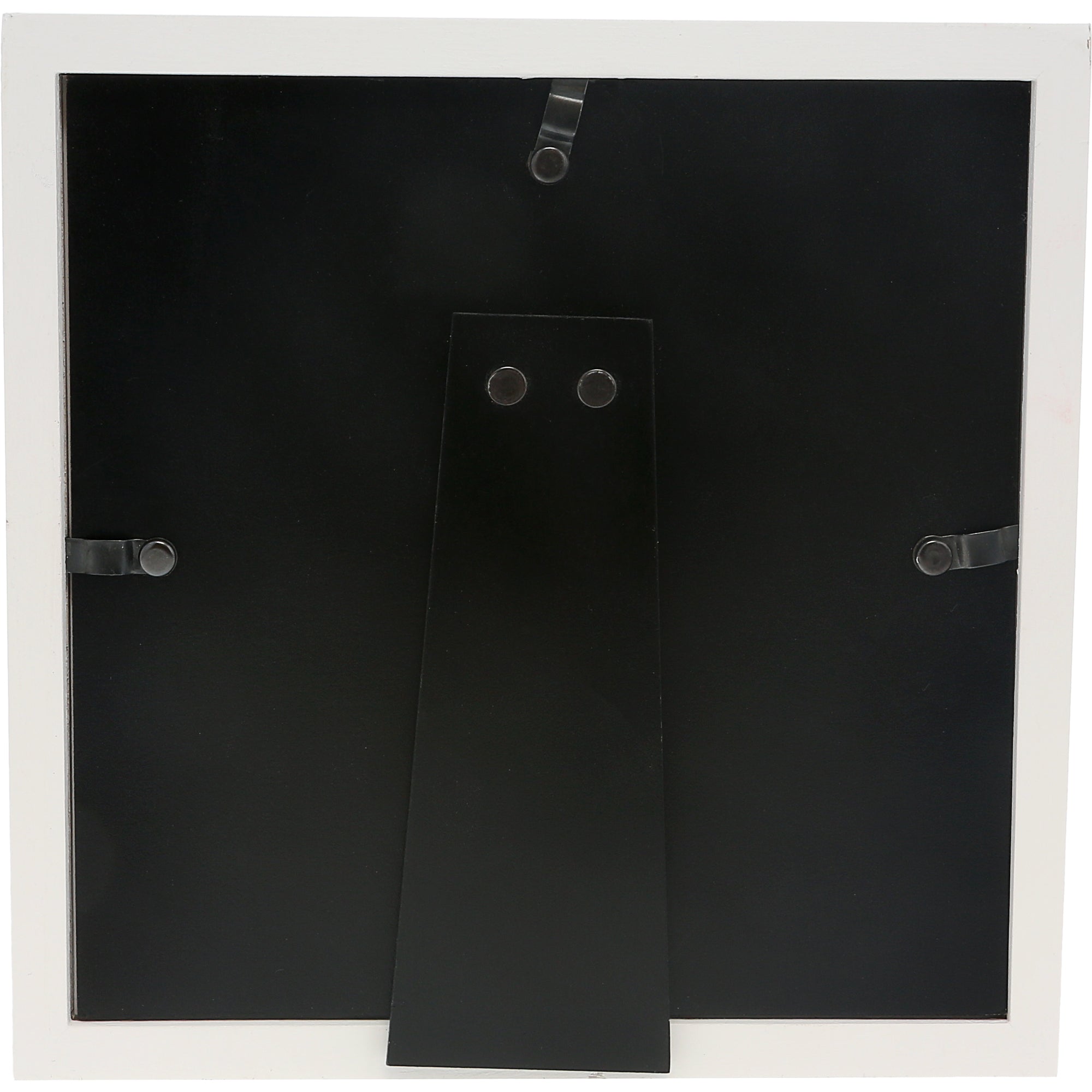 - PREMIUM QUALITY: This square white shadow box photo frame is made from MDF, glass, mat board, and a black thumb tac in the upper right-hand corner. Frame measures 7.5" x 1.5" x 7.5", holds a 4" x 6" horizontal treasured photo, and is packaged in a die-cut box.